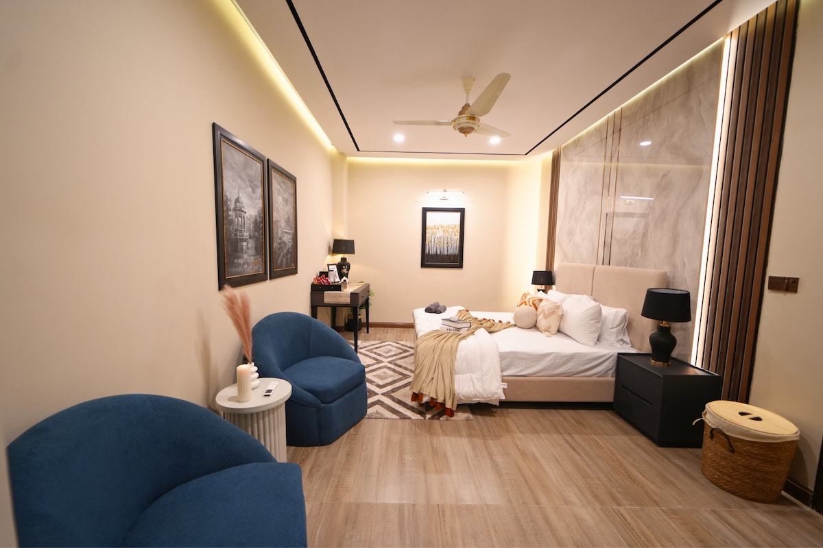 A stylish designer suite located on the 4th floor in the heart of Islamabad, just steps from F-11 Markaz. Bright, airy, and thoughtfully furnished, the space offers a perfect blend of comfort and elegance. Ideal for travellers with a cozy bedroom, modern kitchenette, and secure surroundings. Enjoy easy access to top cafes, restaurants, and shops, all within walking distance. Note: “Strictly only for families, unmarried couples/parties are not allowed” One vehicle parking is allowed