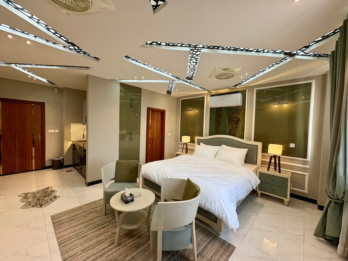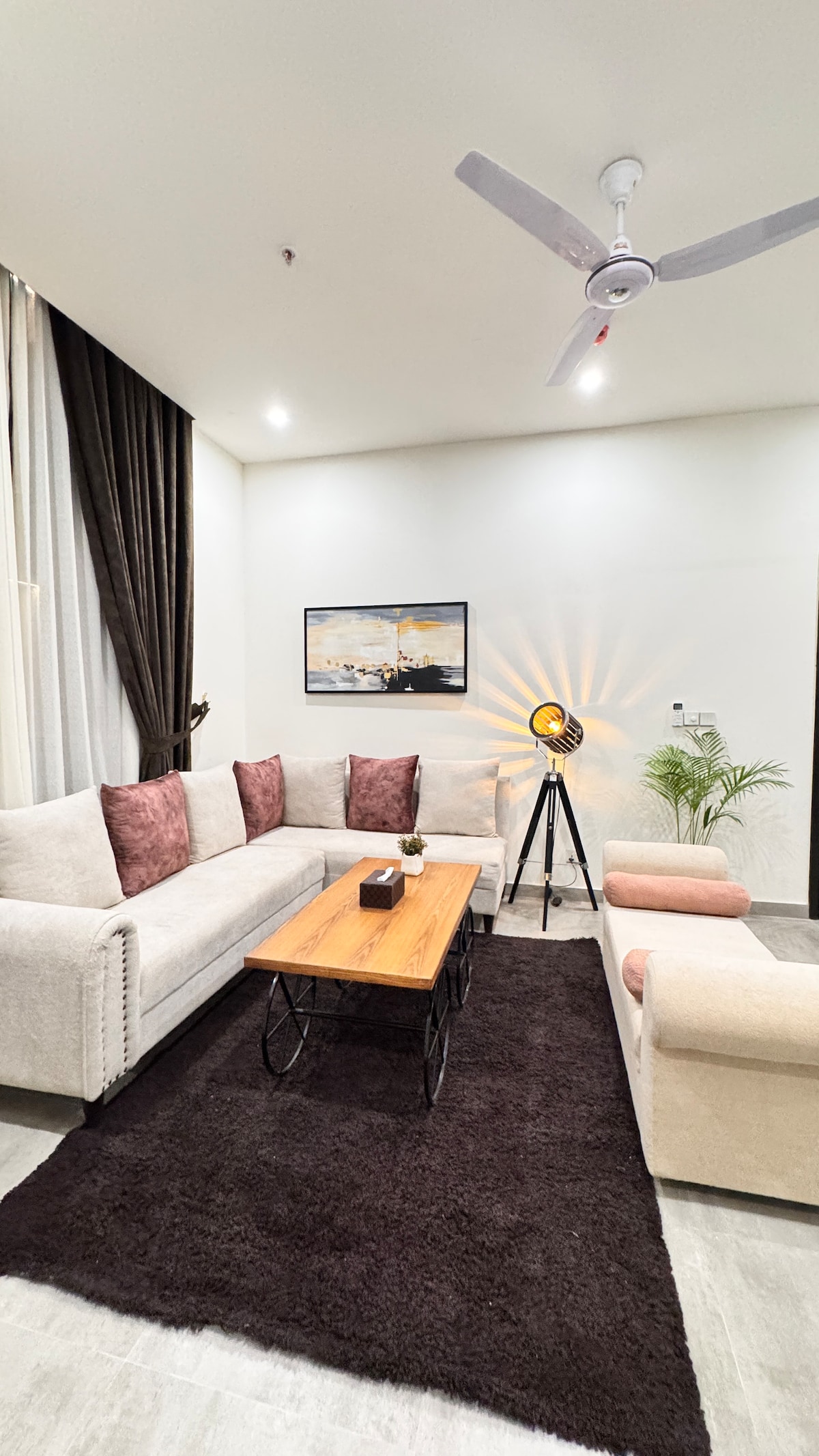 A stylish designer suite located on the 4th floor in the heart of Islamabad, just steps from F-11 Markaz. Bright, airy, and thoughtfully furnished, the space offers a perfect blend of comfort and elegance. Ideal for travellers with a cozy bedroom, modern kitchenette, and secure surroundings. Enjoy easy access to top cafes, restaurants, and shops, all within walking distance. Note: “Strictly only for families, unmarried couples/parties are not allowed” One vehicle parking is allowed