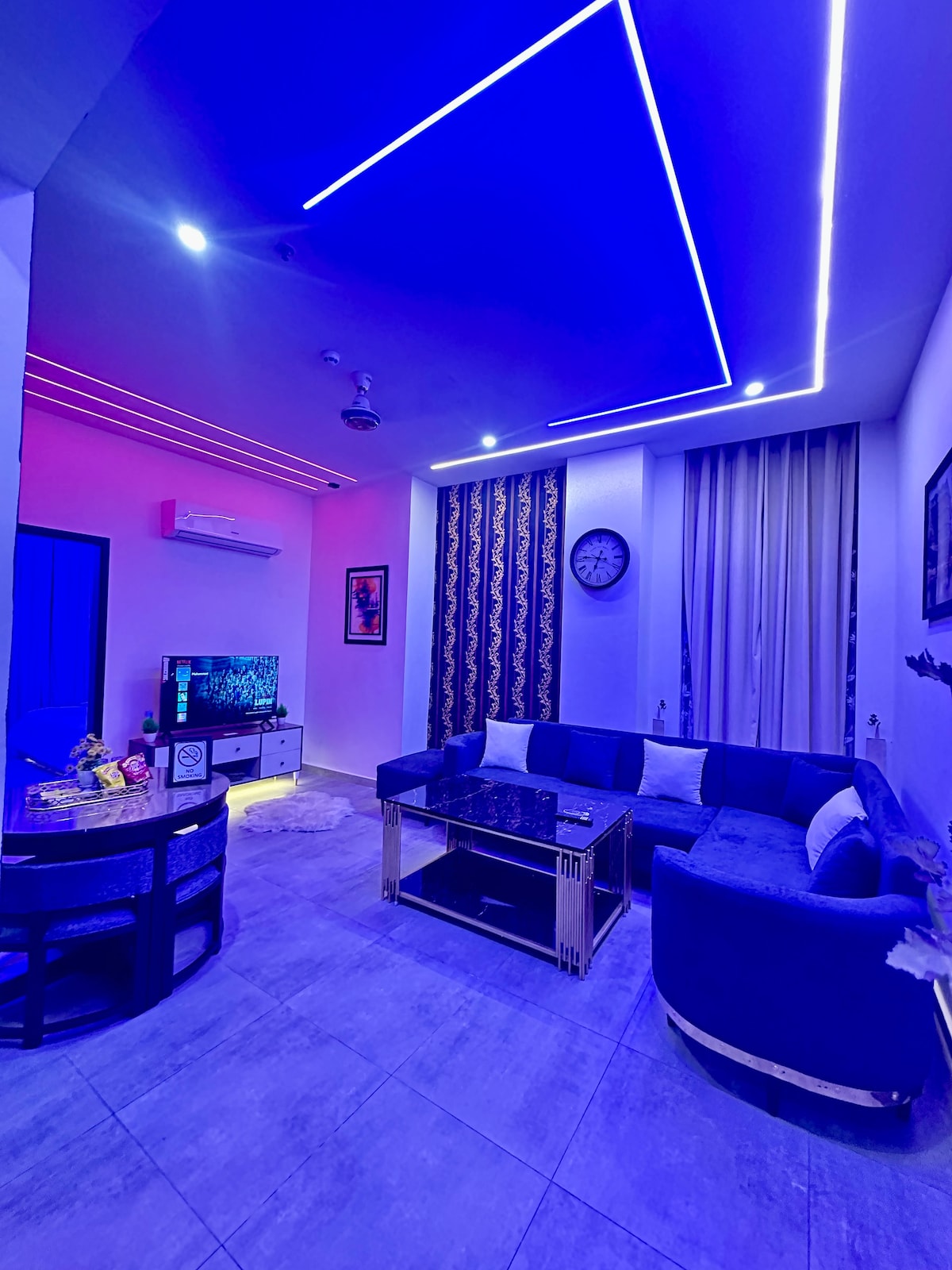 A spacious one Bed apartment King size bed Massage chair Pool table Sheesha for Sheesha lover Massive fire place 65” LED Sound system Netflix and chill Complementary snacks and drinks Bathroom amenities Fully equipped kitchen Heating and cooling system Free of cost cleaning services during the longer stays Scenic view from the terrace Assistance with the luggage available Self checkin available Staff available in the building till 9pm for assistance and to make your stay comfortable