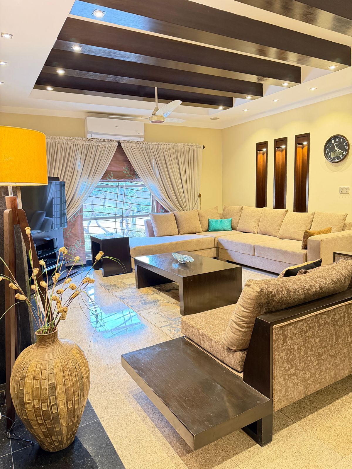 No other rental beats this lavish, Centrally located, secure & immersed in serenity beautifully designed & tastefully furnished independent 3 bedrooms residence with private entrance & parking for families, business travelers & anyone looking for a Royal luxury Home @ Central Location. Soak up the modern & vintage charm of this Royal brand new villa. Extraordinarily lavish designer furnishing, spacious rooms, greenery, spectacular views & workplace. Large beautiful garden to host gatherings.