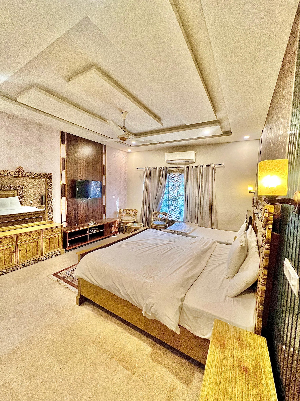 ✔ Completely independent and private ground floor portion ✔ Prices can be adjusted based on the number of bedrooms required ✔ 24/7 Security ✔ 24/7 Electricity Backup ✔ 24/7 Car with driver on-site (additional charge) ✔ Airport pick-and-drop services (additional charge) ♛ These are residential charges; separate package for events ♛ Weddings, birthdays, corporate gatherings, family dinners, professional shoots (bridal, commercial, drama) ♛ Catering, food, photography, videography, & DJ services