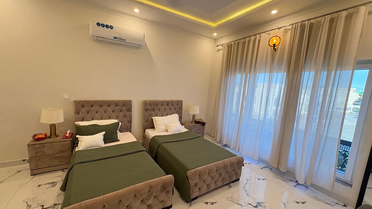 🛏️ Bedrooms: 5 spacious, fully furnished rooms with wooden floors, comfortable beds and wardrobes, mini fridge, reversible AC's and LED TV 🛋️ Living Room&dinning space: 2 Elegant lounges with cozy sofas, and a smart LED TV with NETFLIX & dinning tables. 🍽️ Kitchen Fully equipped kitchen with stove, microwave, utensils. 🛁 Bathrooms: Clean bathrooms with hot water and fresh towels 📍 Location: near F-11 Markaz,mosque, park 📶 Wi-Fi & Essentials: High-speed Wi-Fi, air conditioning, heating.