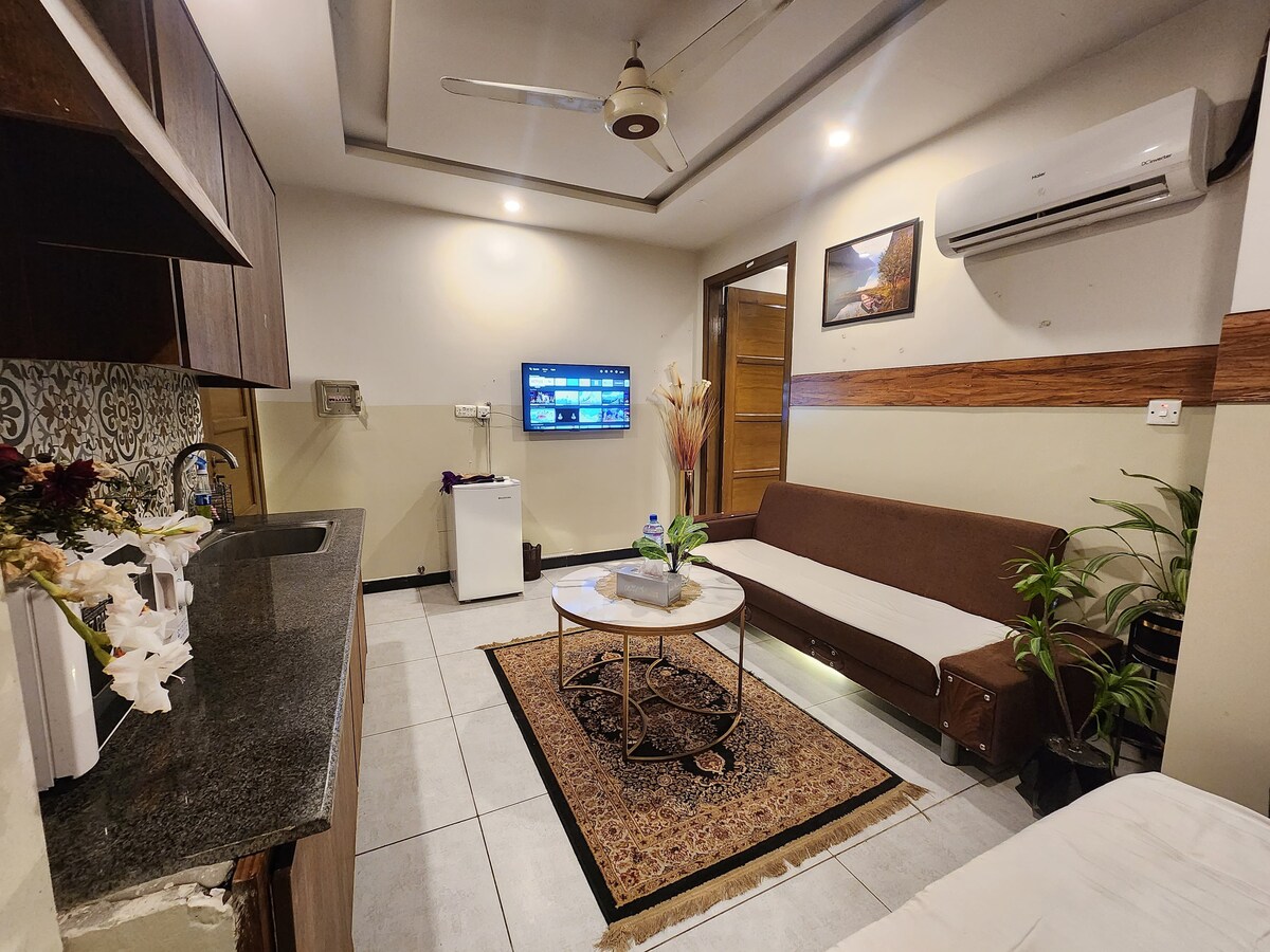 Enjoy the glamour of this stylish, upscale place. Modern Double Apartment designed for comfort and privacy. Features a spacious bedroom with a comfortable double bed, separate TV lounge, and an open kitchen for your convenience. Includes a private attached bathroom in a secure building. Ideal for couples, families, and business travelers seeking a peaceful and stylish stay.