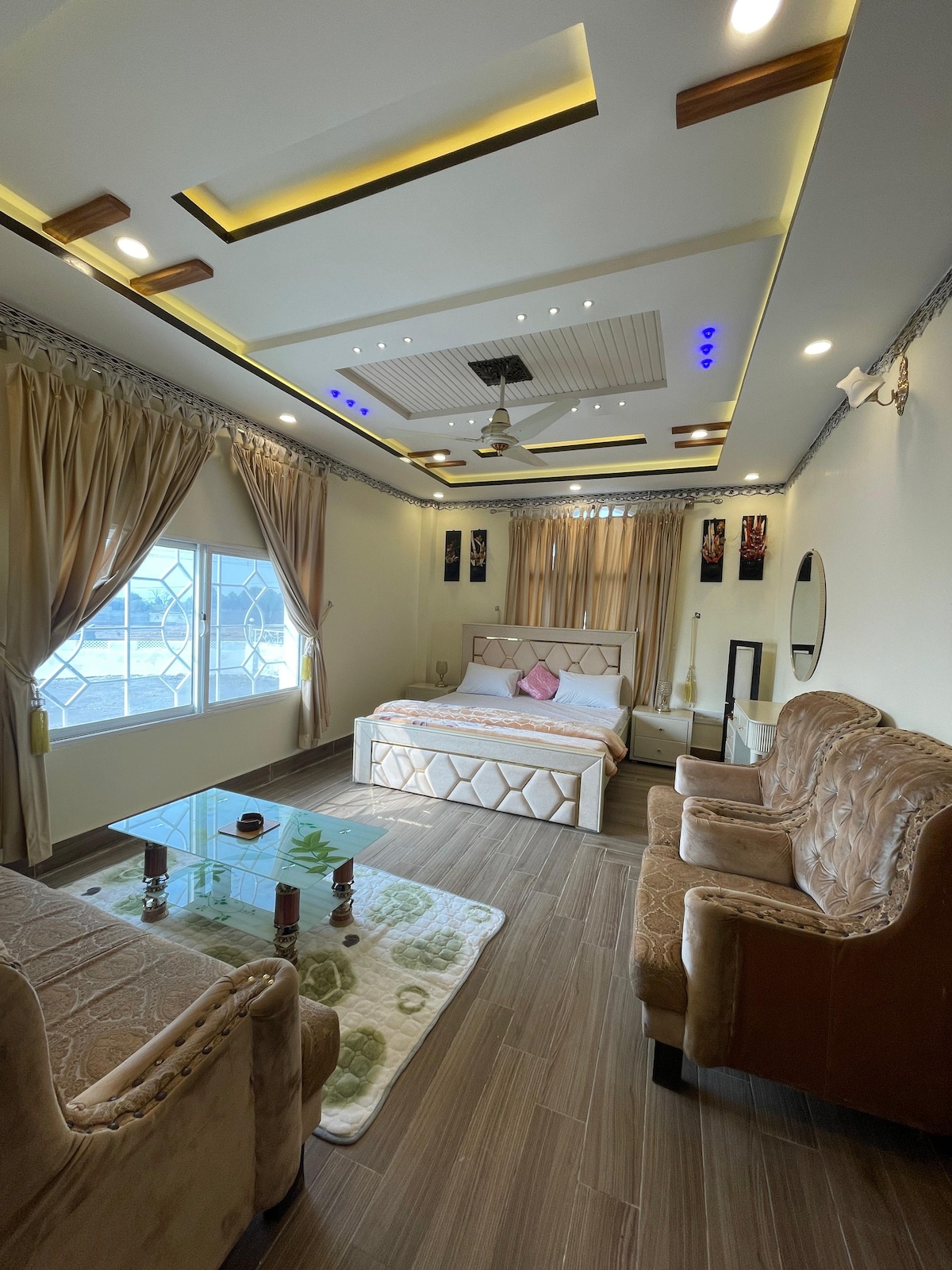 Every bedroom looks amaizing farm house you can book one or more rooms prime location of DHA giga /Gardern city safest place open 4 kanal space area feel like family home safe like home enjoy like you own castle
