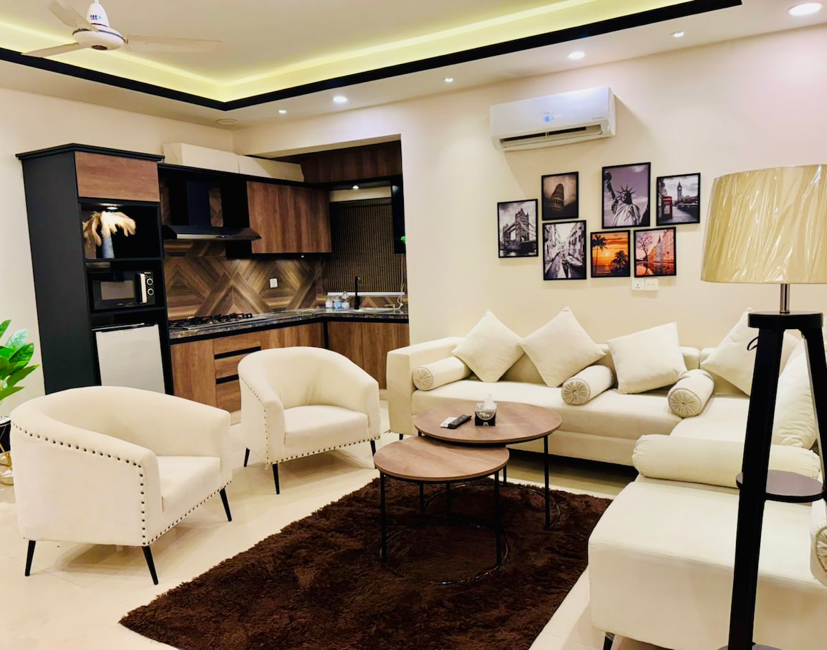 A 1700 sq. ft. 2-bedroom boutique apartment located in the serene heart of Bahria Town. Perched on an elevated floor, this thoughtfully curated home is bathed in natural light and offers both north and south-facing open views with shops and restaurants at just walking distance. Designed for comfort and elegance, it's ideal for families, couples, business travellers, or anyone seeking a peaceful yet well-connected stay in Islamabad.