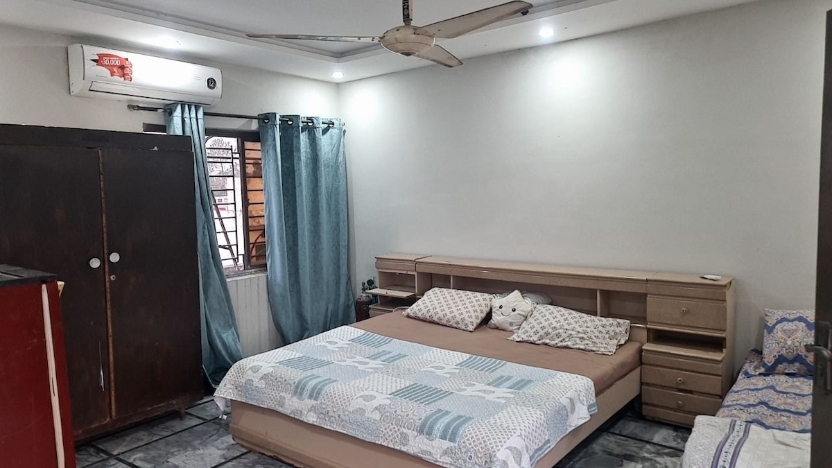 Forget your worries in this spacious and calming house. The first floor is entirely available with a comfortable bed, AC, separate TV lounge and a dedicated kitchen with all the basic amenities. Parking is available on the premises. Self checkin is available with electric keypad for hassle free and smooth entry.