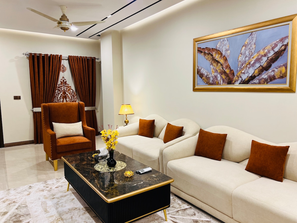 Designed with great care by an interior designer, The Black H comes with a spacious lounge and bedroom, huge 60" LED TV, 10-seater sofa, fully equipped kitchen and a distinctive decoration piece – an ibex's skull (Ethically sourced) – adding a rustic charm to the space. It is located in Bahria Heights 1 Block D, one of the most premium living standard maintained by Bahria Town. All major restaurants and cafes are close-by and building has 24/7 security