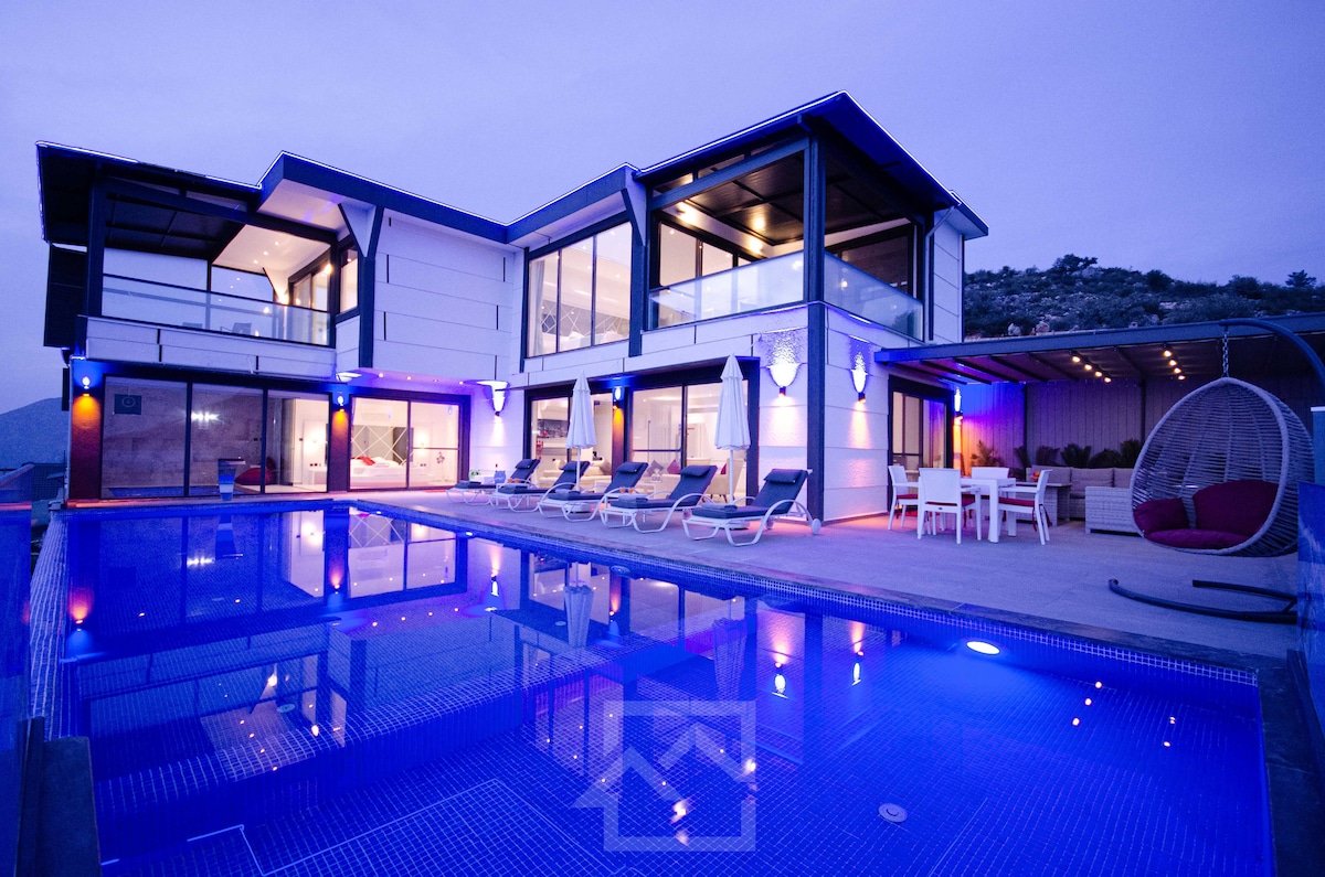This stunning 4 bed/4 bath villa offers breathtaking views from every corner and only 5 minutes walking distance from the beach . Recognized with the 2024 top design award by the Turkish Architecture Board, it features generously sized pool, panoramic windows, luxury marble bathrooms, sauna, gym and several terraces. Located in a Kisla, a high-in-demand upscale area in Kalkan, provides a peaceful and relaxing environment.