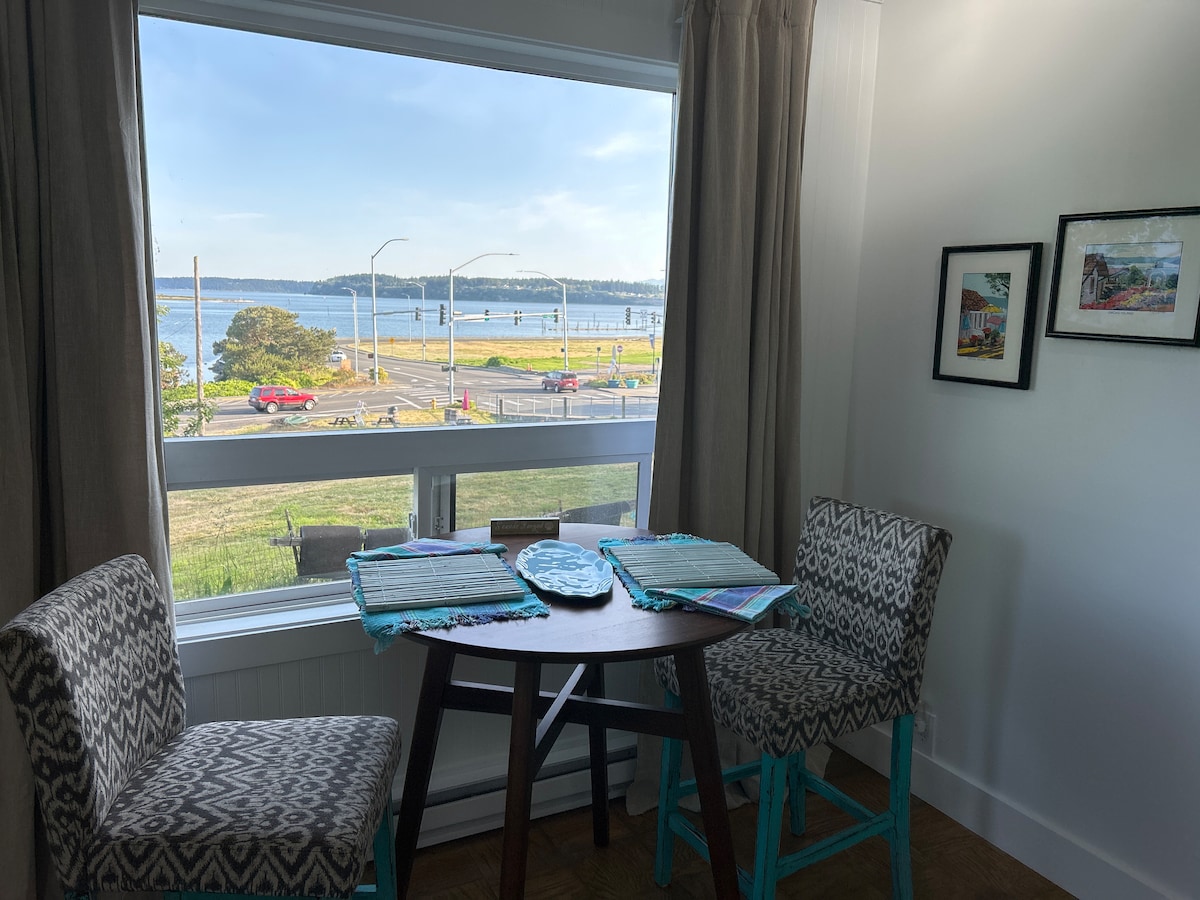 Our Little Cabin is a bright comfortable space with a 1/2 bath, including a sink and toilet. You will have access to a private full bath with roomy shower and laundry facilities accessible through our garage any time. There is a small refrigerator and microwave as well as Keurig coffee. There is a large window facing the garden with a view of the water through the trees. Longpoint Beach at the opening to Penn Cove is a 10 minute walk through our quiet neighborhood.
