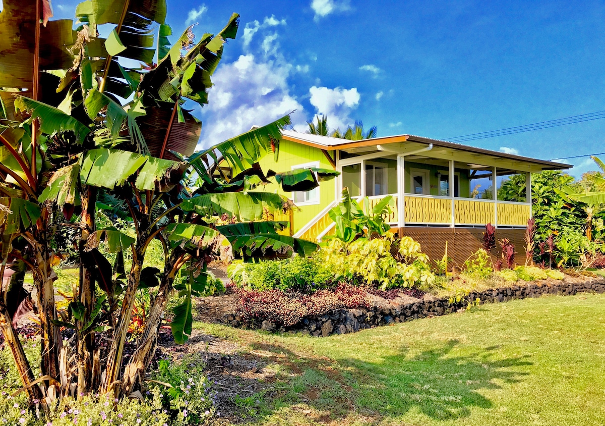 Licensed vacation rental on small banana farm 1 mi. from Kehena black sand beach, one of the least developed populated coasts in Hawaii. King bed, AC, full kitchen, screened lanai, outdoor shower & Jacuzzi bathtub/shower. Nearby viewing of the 2018 lava flow, swimming, snorkeling, hiking. Located in rural Kalapana Seaview neighborhood. Nearest store 10 mins, town with services is Pahoa, 20 mins away. Hilo, 45-60 minutes away. Volcano Park 1 hour. All of island accessible for day trips.