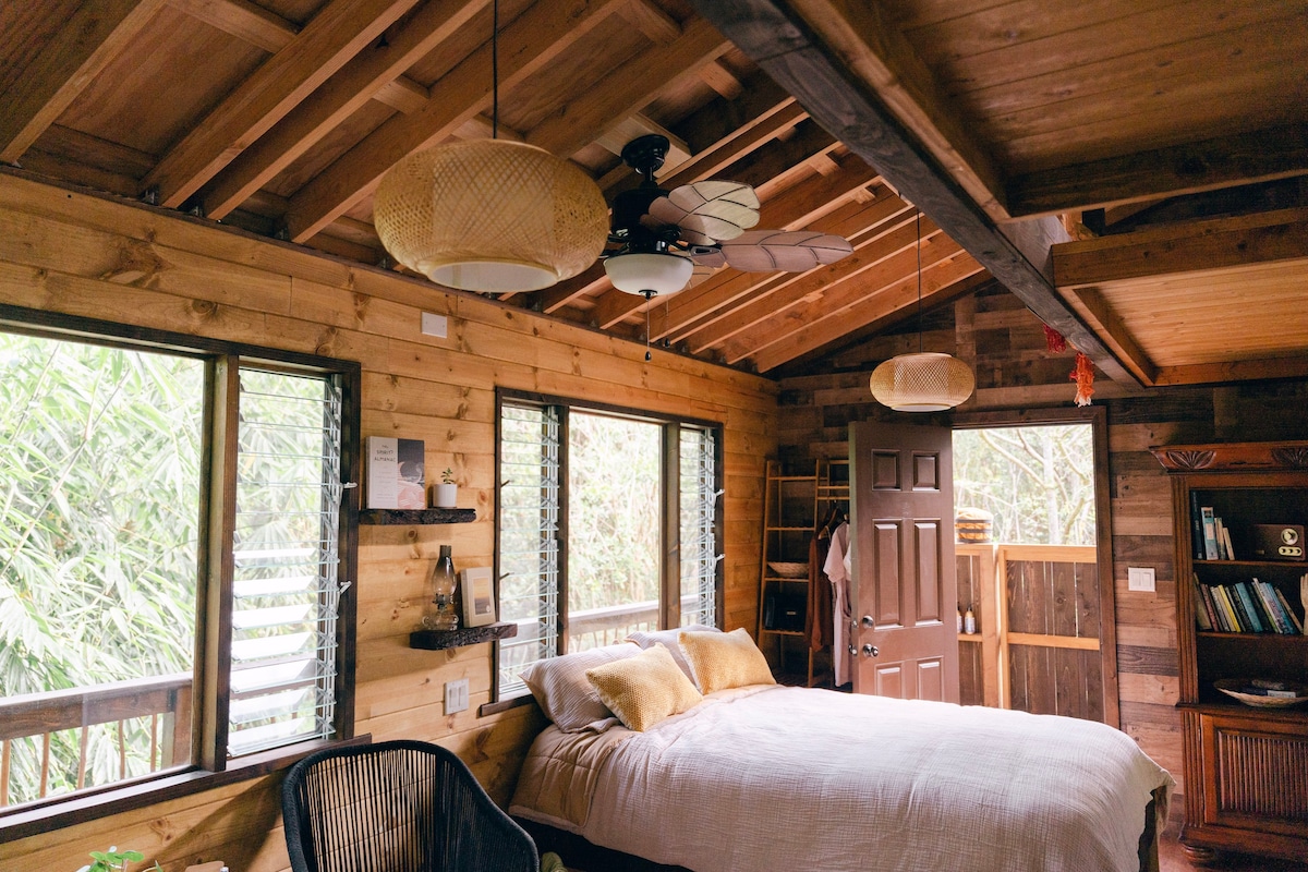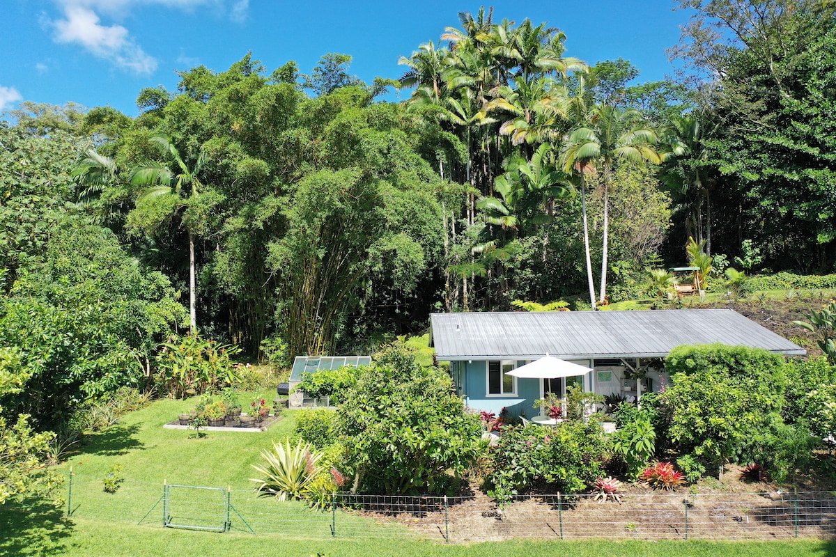 A beautiful get-away surrounded by nature on a cacao farm! One-bedroom + loft cabin, full kitchen, bathroom, w/d, sunny lanai, on our Big Island off-grid permaculture farm. Cabin is nestled in a food forest a few hundred feet from a stunning waterfall with swimming hole in a peaceful bamboo grove. One king-size bed in bedroom, two twin beds in loft, which has low ceiling & is accessed by steep narrow stairs. Free entrance to botanic garden. Organic eggs, homemade chocolate at farmstand!