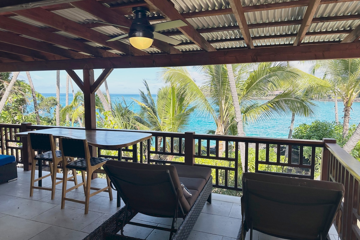 Waterfront cottage on private, gated 1 acre estate. Close as you can get to an over the water bungalow in Hawaii with direct ocean access to swim, surf, kayak, snorkel and watch dolphins. Walking distance to manta ray, snorkeling, kayak, whale and dolphin tours, golf, restaurants, movie theater, and outdoor art market. Two room suite. Queen bed. Living room with 50 in TV. Bathroom with large shower. Large covered deck with seating area, kitchenette, dining table, lounge chairs. Outdoor shower.