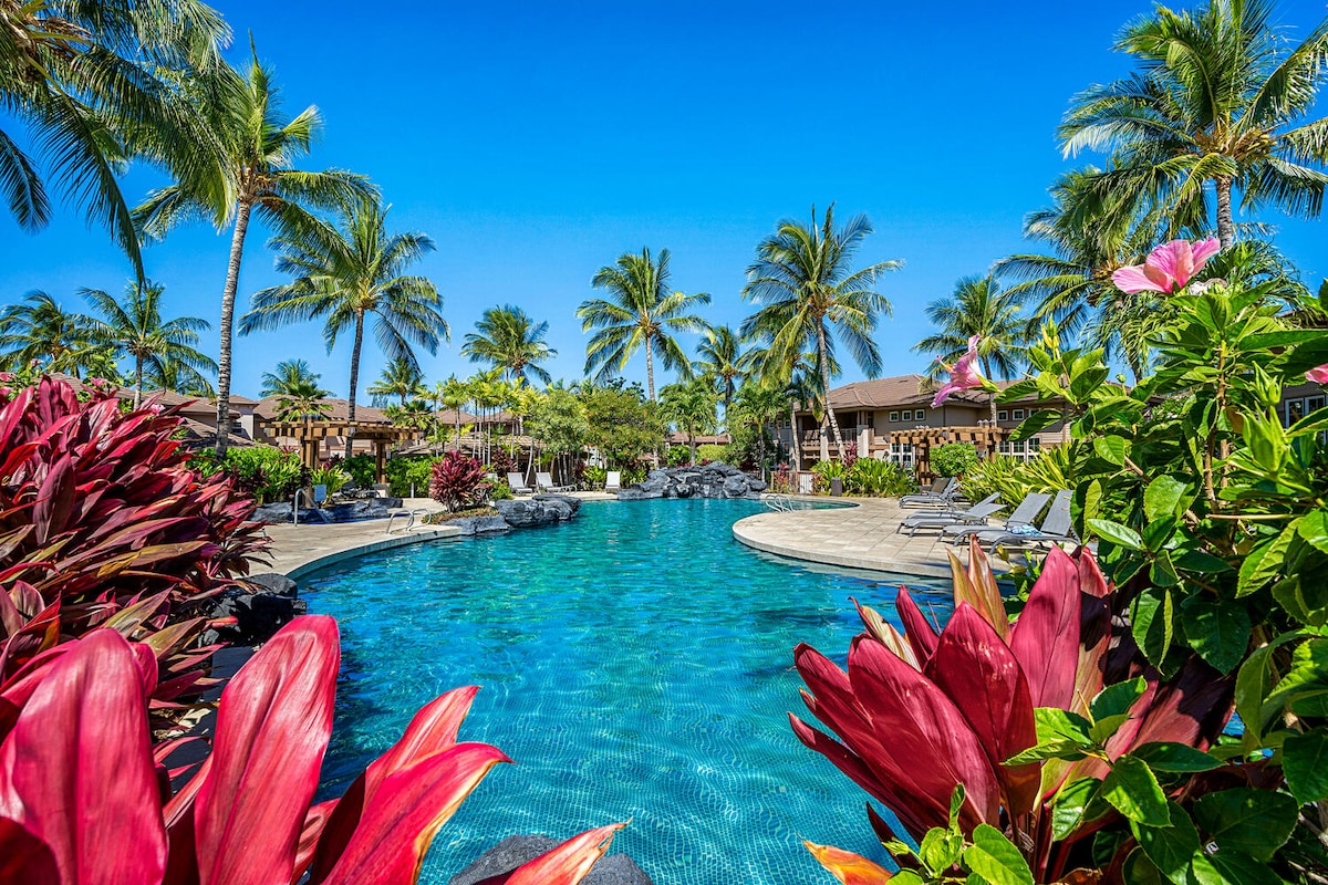 OCEANFRONT Kanaloa 3Br 2+1/2 Ba AC SPACIOUS 2000 sq ft. FREE Parking. FREE Resort Fees. FREE AC. Enjoy Meals Out on your Oceanfront Lanai. King Beds. Twins avail. Walk to Keauhou Harbor (Snorkel Tours, Manta Ray Boats), Secret Cove (Hee'eia), Movies, Market, Restaurants 5 min drive to Kahaluu 3 Pools, Hot Tubs, BBQs, Clubhouse, Oceanfront walkway, 16 Acres of tropical grounds. 15 Stairs 2 night min $298 cleaning & 17.96% Hawaii tax is shown on your Airbnb quote.