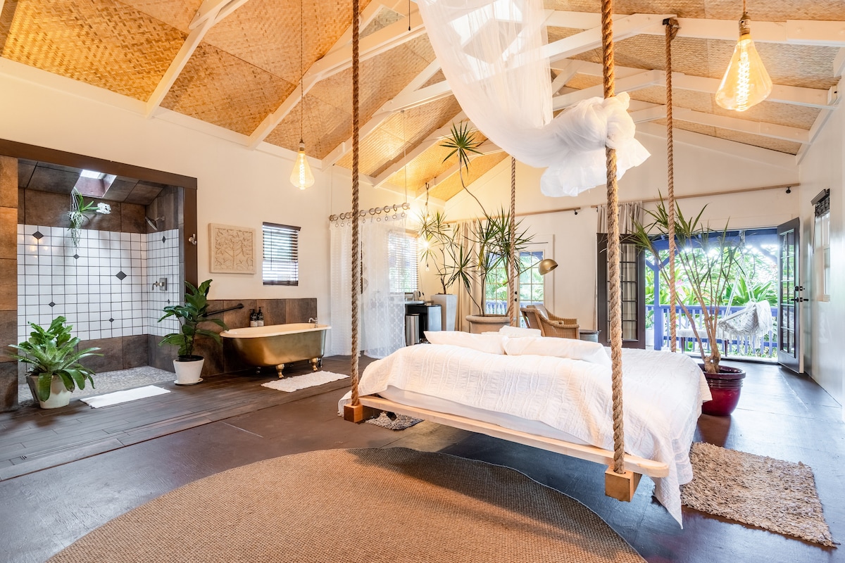 Top floor of our home on Pahoehoe Stream in quiet Papaikou north of Hilo on Hamakua Coast. Big open living area + sleeping alcove w/ king bed overlooking our yard and an additional bedroom w/ a queen bed & desk. Even an optional room w/queen sofa bed & desk! Inquire re: the 2024 Chevy Equinox EV we have for discounted Turo rental for guests (see photos for more info). This listing is hosted & exempt from Hawaii County STR registration (Bill 108). Hawaii GE-067-950-7968-02 & TA-067-950-7968-01io