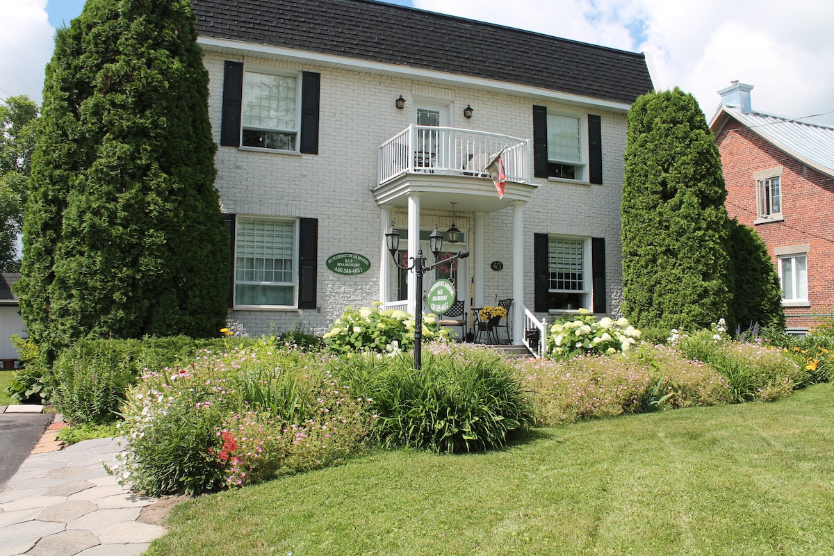 Voir aussi au tournant 1 de la rivière et au tournat 3 de la rivière. Maison victorienne datant de 1876 au bord de l’eau, possédant une vue imprenable sur le méandre de l'Achigan et un jardin fleuri exceptionnel. La maison est située près de trois golfs et deux pistes de skis de fond. Le tarif de la chambre inclue le petit déjeuner pour deux personnes. Deux vélos disponibles