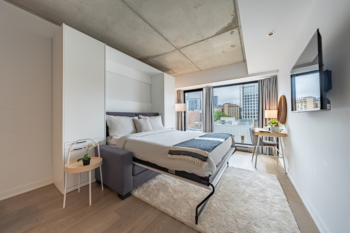 Super new studio, furnished, on the top floor, for rent! 2 steps from St-Laurent metro, UQAM and the Latin Quarter Very well located on St-Catherine Street between Place des Arts and the Village at the intersection of St-Elizabeth Street Fully furnished: bed with mattress, fridge and freezer, oven, dishwasher, microwave, washer and dryer Rooftop terrace, gym and co-working space