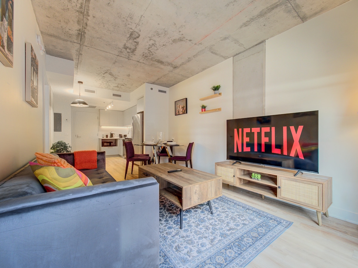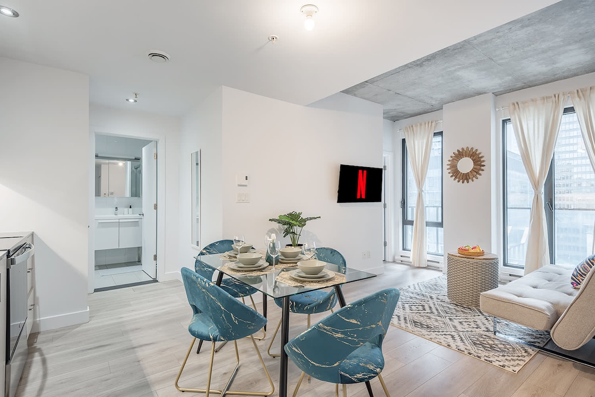 Enjoy your stay in the heart of the city ! Brand new TDC 2 downtown luxury with direct Bell Center access! Revel in comfort in our fully furnished and equipped one-bedroom condo with own private balcony! Your stay includes access to a sauna, pool, gym, skylounge, gaming room, lounge, and terrace with multiple barbecues. Free underground parking, with the subway just minutes away. Without stepping outside, the city is yours to explore. Plus, unwind with complimentary Netflix for the perfect stay
