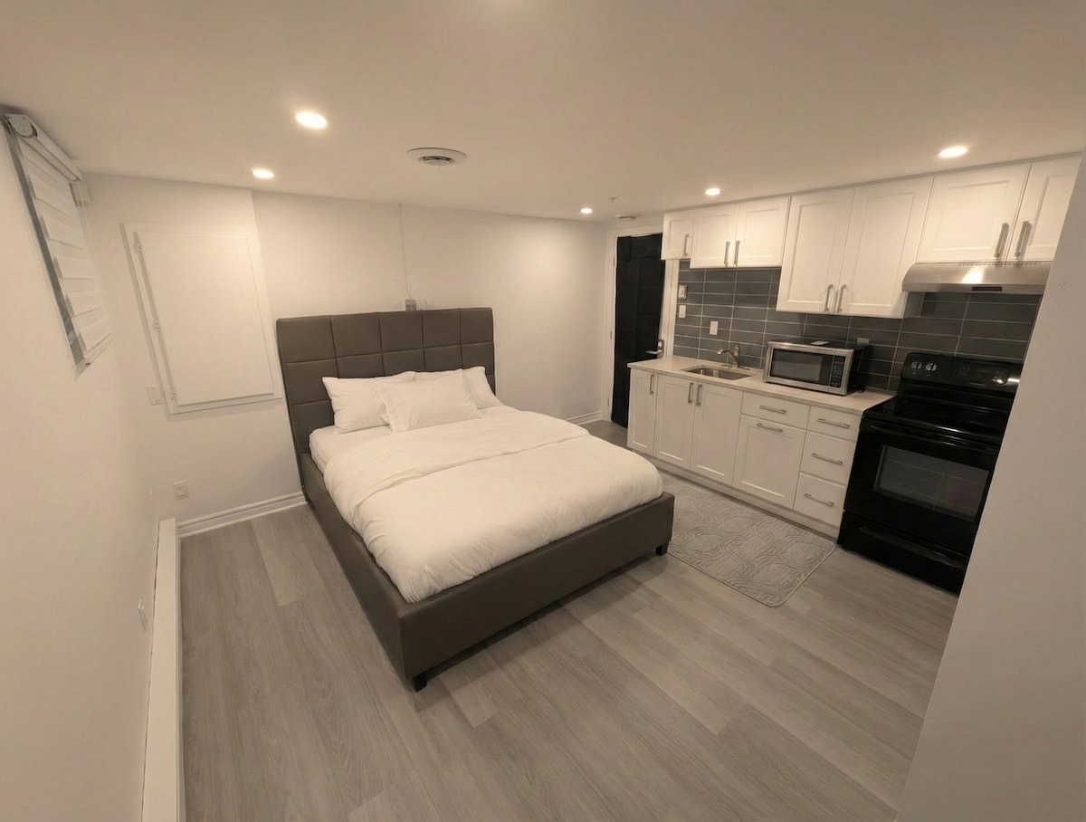 Fully Equipped 4 1/2 Basement + Solarium 1 Bedroom + Kitchen + Living Room + Bathroom. Private Hot Tub - Available 24/7 Though it's a basement, there are lots of sunlight coming in. High Speed WIFI + Smart TV For any drummers/musicians out there, there is an Electric Drum Set free to use! Private Entrance & Free Driveway Parking. We provide complimentary Bottled Water, Ground Coffee, Tea & Snacks. We do NOT allow Parties/Events/Gatherings.