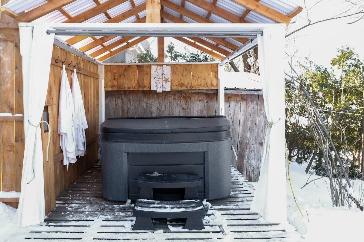 40 minutes from Montreal, Small rustic log cabin, in the park of the North River, canoe kayak, bike path, cross-country skiing. Mezzanine and double mattress, in the living room double bed ... kitchenette, shower, HEATED POOL (May to October) and gazebo. Large TV (Netflix included), high speed internet access. Ideal for a couple. Close to all services, 7 minutes from St-Sauveur-des-Monts, 50 restaurants, alpine skiing, hiking trails, Water park, cinema, etc. ask!