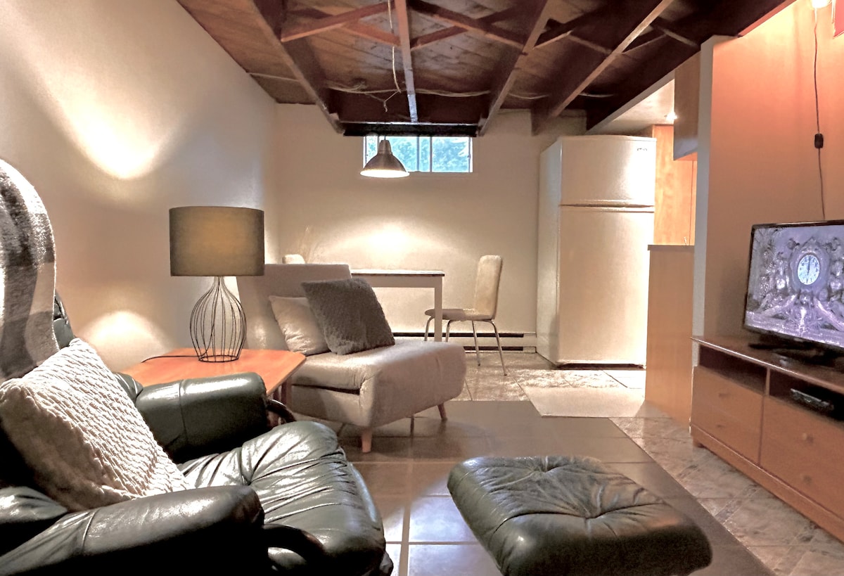 Small studio (6 by 22 feet) (it is not basement) (ONLY FOR NO SMOKER) with private bathroom, private kitchen, private entrance and private parking in a single-family house. It is equipped with a wall-mounted heat pump, induction cooktop, small oven, microwave, refrigerator, underfloor heating, humidity detector, oil heater, Smart TV (Bell TV). The bed is not double, it is queen. Washer and dryer are shared. Several shops within walking distance.