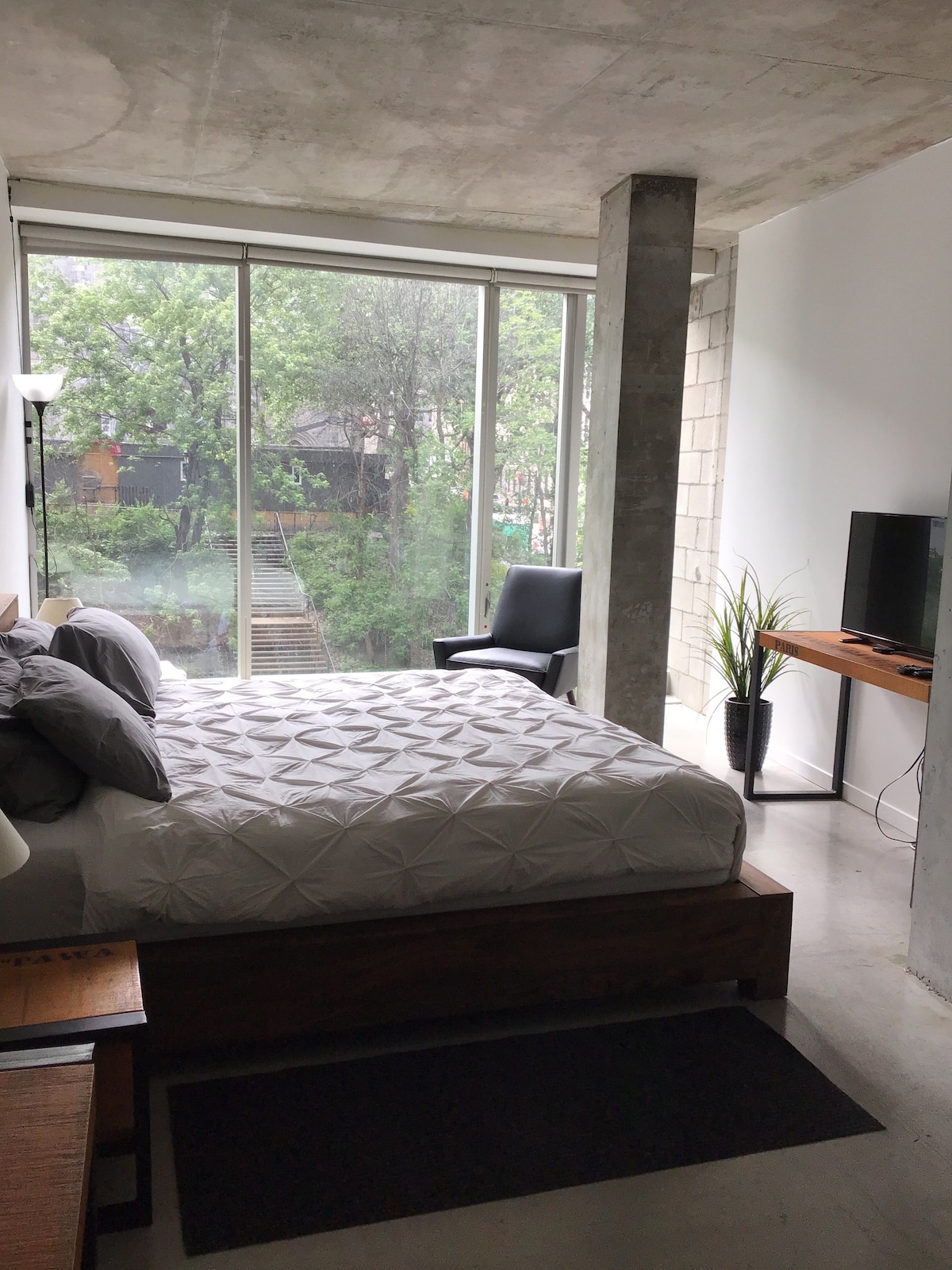 Un loft avec balcon, salle de bain privée, cuisinette privée, entrée et stationnement privés dans une maison unifamiliale proche de Montréal. Il est équipé par thermopompe murale, table de cuisson à induction mobile, petit four en acier inoxydable, plancher chauffant, détecteur d'humidité, smart TV(Bell) etc. Le est queen. Laveuse et sécheuse sont partagées. Rénovation complétée en janvier 2023. Les meubles sont de 2023. Plusieurs commerces accessibles à pied.