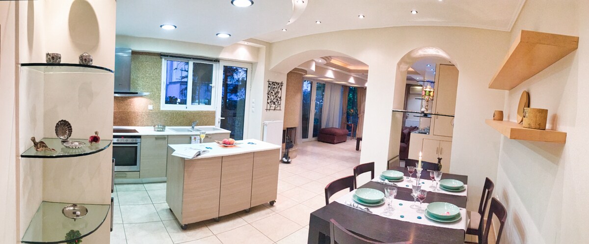 Great 2 bedroom condo on 2nd floor (elevator), in fashionable Pangrati near museums and art galleries, the ancient Olympic stadium and downtown, great local restaurants, cafés and amenities. Tastefully furnished and decorated with original art, fully independent central heating & air conditioning for year-round comfort, mosquito screens, luxury bedrooms and modern bathroom. Sunny balconies, dining area, cable TV & Netflix, full kitchen with top appliances including washer/dryer. A lovely home!