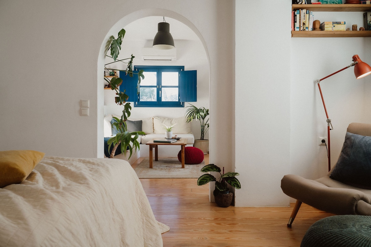 Just 50 meters from the Aegean Sea, this bohemian retro apartment blends comfort and relaxation. It features a fully equipped kitchen, a king-size bed, and a sofa that converts into a double bed, accommodating up to 4 guests. Enjoy two balconies—one facing the peaceful backyard, the other in the bedroom, offering a side view of the beach. With retro décor and a 45-inch smart TV, this apartment provides a modern, serene space to unwind, steps from the Aegean Sea.