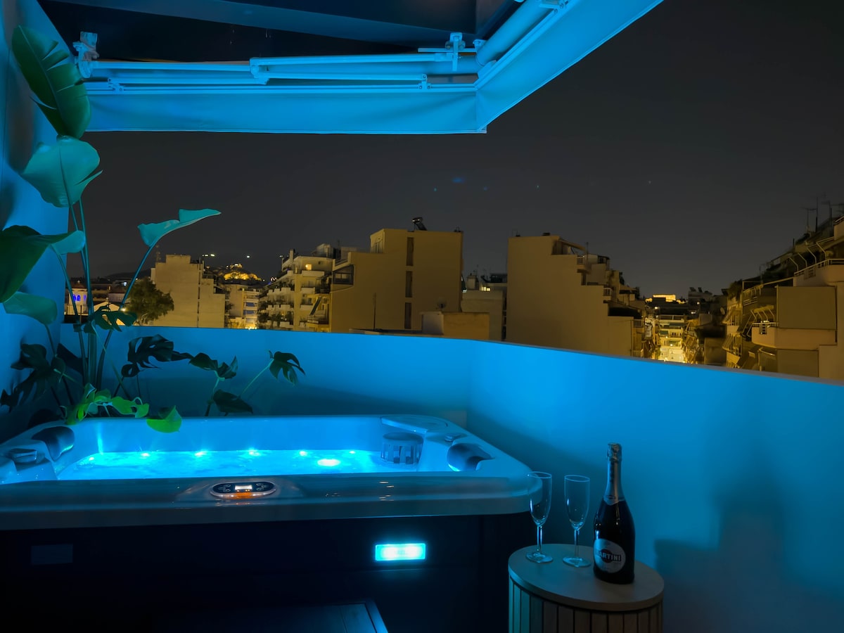At the Iris Penthouse you will stay in a brand new building in the heart of Athens. Entering the Penthouse be greeted with spectacular views of the Acropolis, an XL balcony and premium amenities. After exploring Athens, rejuvenate in our bubbly Jacuzzi while the fireplace flickers and the Marshall speakers play your favorite tunes. Just 1 min walk to the metro, 13 min to the Acropolis gates, and surrounded by amazing restaurants, cafes and incredible nightlife. Experience the Best of Athens!