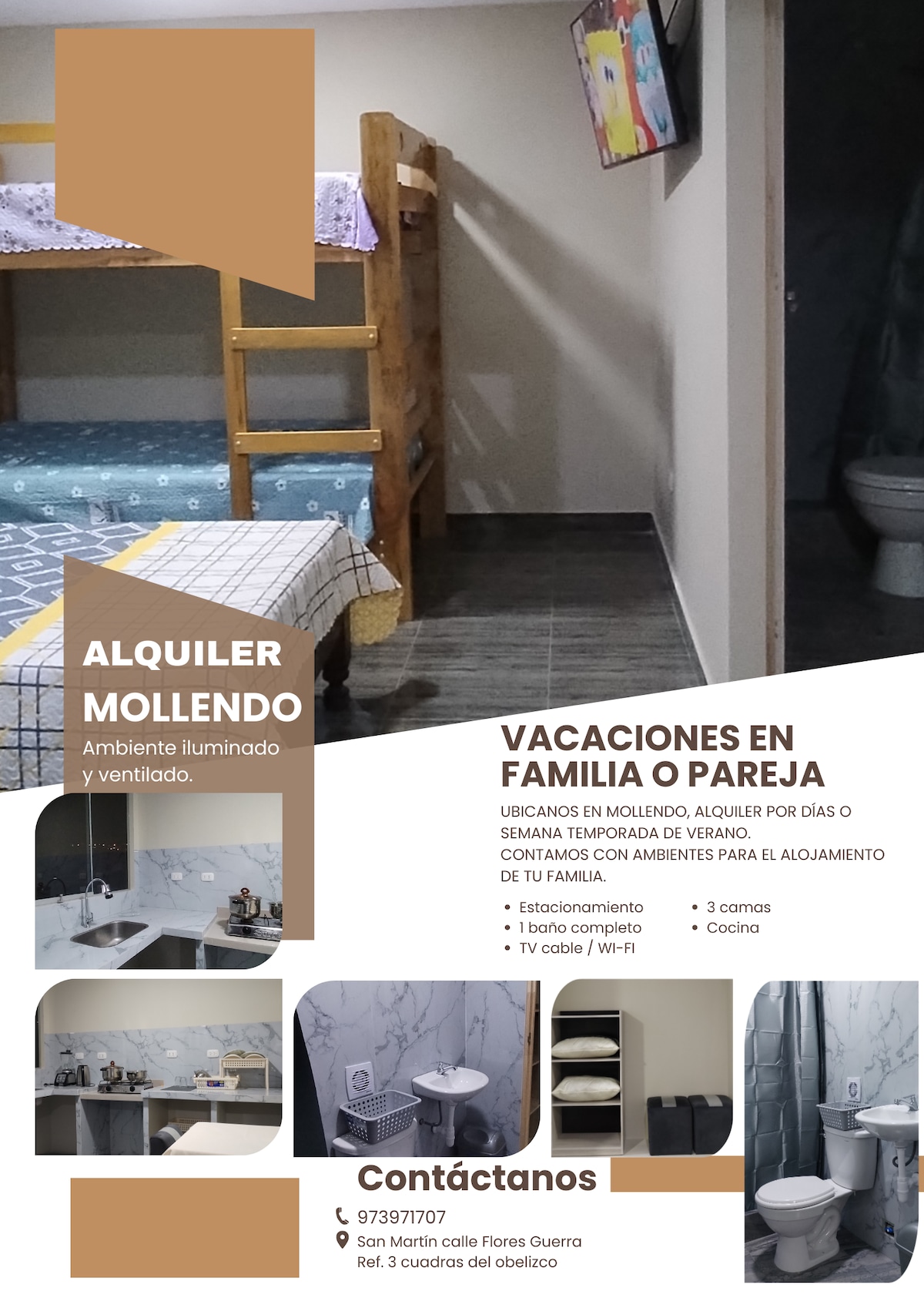 Moderno minidepartamento AMOBLADO Ubicado a sólo 5 minutos (EN AUTO) del centro de Mollendo y a 7 minutos (EN AUTO) de Catarindo Cuenta con 01 habitación amplia con DOS CAMAS de 02 plazas, TV de 40¨ y baño completo con ducha y agua caliente las 24 hrs. Área de cocina con electrodomésticos, mesa de comedor y sala de estar con ½ baño, sofá y TV de 40¨ INCLUYE: Agua potable, luz, WiFi, uso de COCHERA y terraza compartida - Permite alojar un MÁXIMO de cuatro (04) personas entre adultos y niños