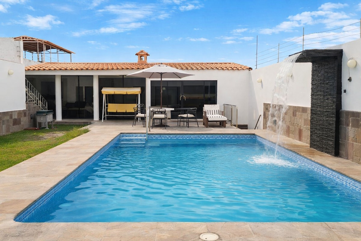 Relájate con toda la familia en este tranquilo lugar para quedarse en vacaciones. Contarás con una casa completa con amplia piscina en el primer piso, acceso directo a la playa, terraza con parrilla, agua caliente, todos los servicios y completamente amoblada. Además podrás disfrutar de las instalaciones de nuestro condominio como canchas de froton, tenis, fulbito, Voley, piscinas y fogateros en la playa. Ideal para familias.