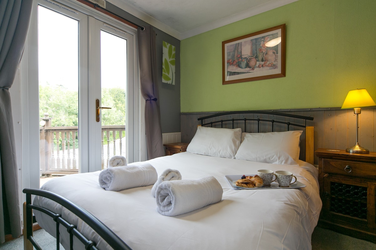 This beautiful 3 bedroom riverside cabin has an open plan lounge 2 double bedrooms & a double&single bunk room (bedding included) towels are not provided central heated very large decking area with breathtaking views of the salmon river,swimming pool open end may - early sep,bar/restaurant weekends from end of March all week from June and Route 66 cafe and shop (open most days). Gas and electric provided , 6 miles from Snowdonia check in 3pm and check out 10am,one large or 2 small dogs welcome