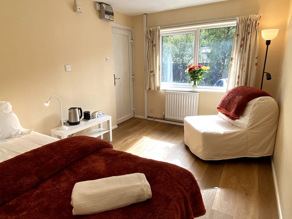 The Annex, en suit King size bedroom with garden view upstairs and downstairs have your own living room with log burner. Juliette balcony in the bedroom looking over the garden. French double door open to the patio in and enjoy garden view. Close your eyes and listen to the birds song all day. No breakfast. Only provide tea and coffee. We have fridge, microwave, toaster and kettle.air fryer. Private entrance. 5 minutes walk to the pub, 5 minutes drive to the beach.