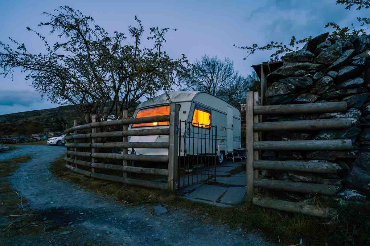 Wecome to the little caravan with amazing views and sunsets. This is the perfect place to get back to basic, simple, peaceful living in sweet clean air. Its warm, cosy and comfortable with plenty of places to relax or play. On a hill over looking Angelsey and the coast, a perfect location to make the most of Snowdonia. Mountains, Sea, beaches, great restaurants, Zip World, steam trains, castles, climbing, all on the door step. Camping, campervan spaces and fully catered options available.