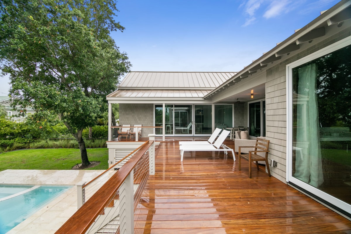 Enchanting house like no other on the island! Designed for guests who value a five-star experience. This luxury getaway is far from ordinary, it is simply perfect. - Right on the world-renowned Wild Dunes golf course - Only .5 mile from the beach -Enjoy FABULOUS SUNSET VIEWS OF THE INTRACOASTAL WATERWAY from the cozy porches - 3 king beds and 6 single bends - Soak away tension in our romantic 2-person tub or in the 8 person tub - Gym, infrared sauna - Game room: pool and Foosball