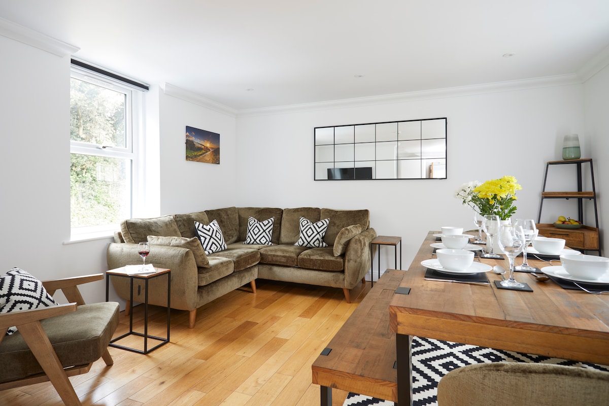 Situated in a waterside location in the heart of historic East Cowes, the apartment offers stunning river views and is ideally placed for all the amenities offered by this maritime town, whilst Cowes is within easy reach. The apartment offers stylish accommodation with two double bedrooms (one en-suite), bathroom, open plan kitchen and dining area (ideal for entertaining with the table comfortably seating up to ten) and spacious triple aspect sitting room designed to make the most of the incredible views. The accommodation is best suited to adults, and please be aware that access is via a flight of stairs from a private entrance hallway, with space for bike storage and other equipment. East Cowes is one of the gateways to the Island, and as such the Red Funnel car ferry terminal is under a minute’s drive away. There are several local shops and restaurants (we particularly like Prego - excellent Italian food and they do takeaway) all within a 100 metre radius of the apartment, and Waitrose is around a two minute walk, so no need to worry about bringing lots of supplies with you. If you’re keen to do some sailing/boating during your holiday, you’ll find East Cowes Marina within a five minute drive/fifteen minute walk. This 380 berth marina offers modern facilities and parking, and there’s also The Lifeboat pub immediately adjacent, offering good local food and refreshments. Osborne House, Queen Victoria’s summer retreat, is within a five minute drive/twenty minute walk, and is well worth a visit at any time of the year. The beautiful grounds and private beach can be enjoyed on a fine day, and as the Island is one of the sunniest places in Britain we have a lot of those! The apartment is situated just a few steps from the chain ferry, linking East Cowes with Cowes, the renowned home of international sailing. The three minute crossing followed by a short (ten minute) walk takes you into the heart of Cowes, with its wide range of boutique shops, restaurants and bars. Cowes Yacht Haven is therefore easily accessible, making the apartment a superb option for a Cowes Week visit. If you’re keen to get out and about and explore more of what the beautiful Island has to offer, why not take advantage of the many bus routes which depart from East Cowes (right outside Waitrose) and venture further afield. Carisbrooke Castle is a short journey, along with the county town of Newport with its range of high street shops, cinema and harbour. The Isle of Wight Festival is easily accessible from East Cowes, with buses almost taking you door to door, and don't forget about other events such as the Beer & Bus Festival and classic car shows