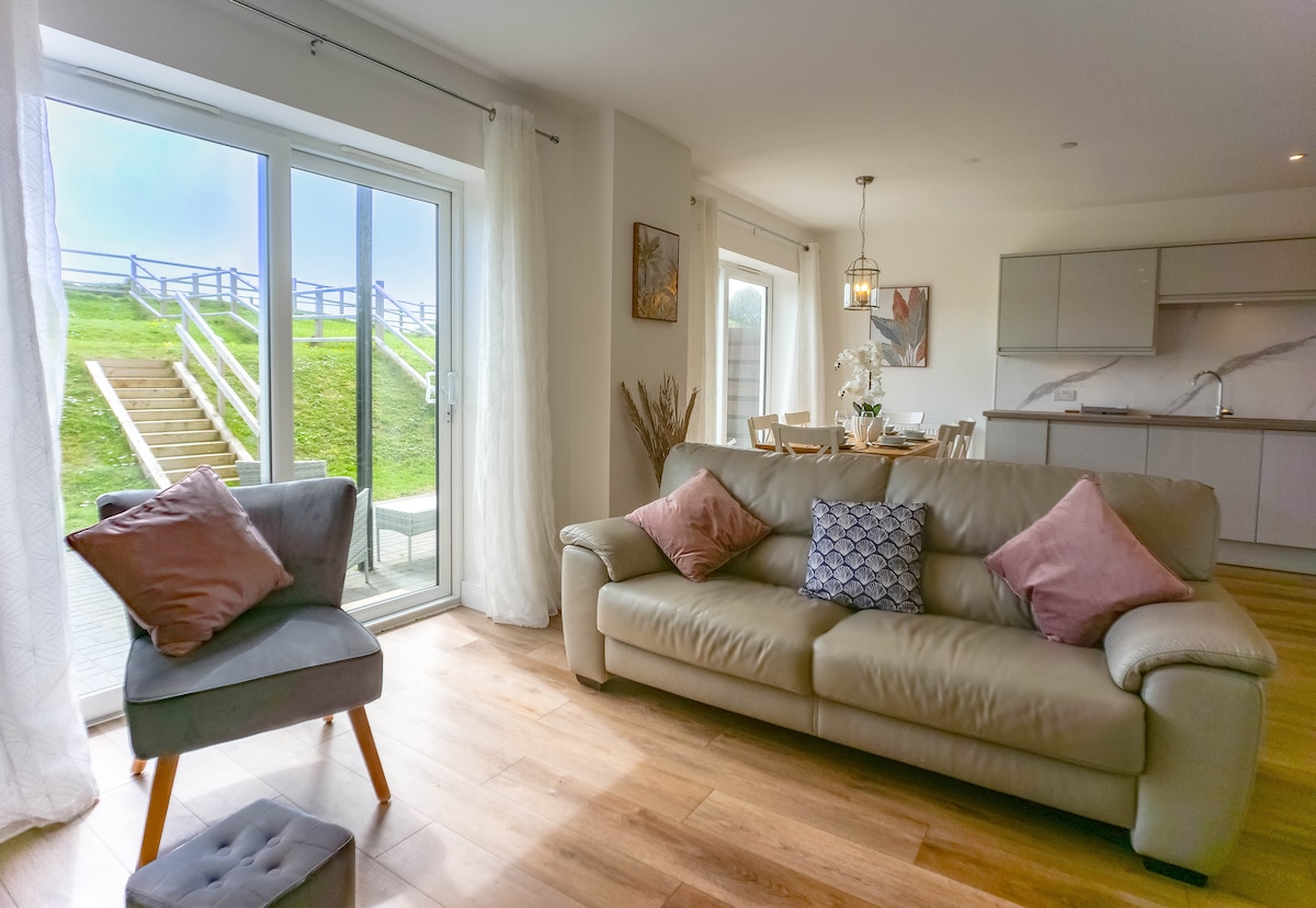 Needles' View at Chale Bay Farm is an air-conditioned family-friendly self-catering apartment with stunning views towards the Needles. The living area features a contemporary open-plan, fully-equipped kitchen with oven, hob, microwave, fridge, freezer, dishwasher and combined washer/dryer and adjacent dining and lounge/sun-room. Sleeps up to 4 (or 5 with sofa-bed or cot) but you can add more space by booking our stand-alone room Tennyson View or one or more of our other adjacent apartments.