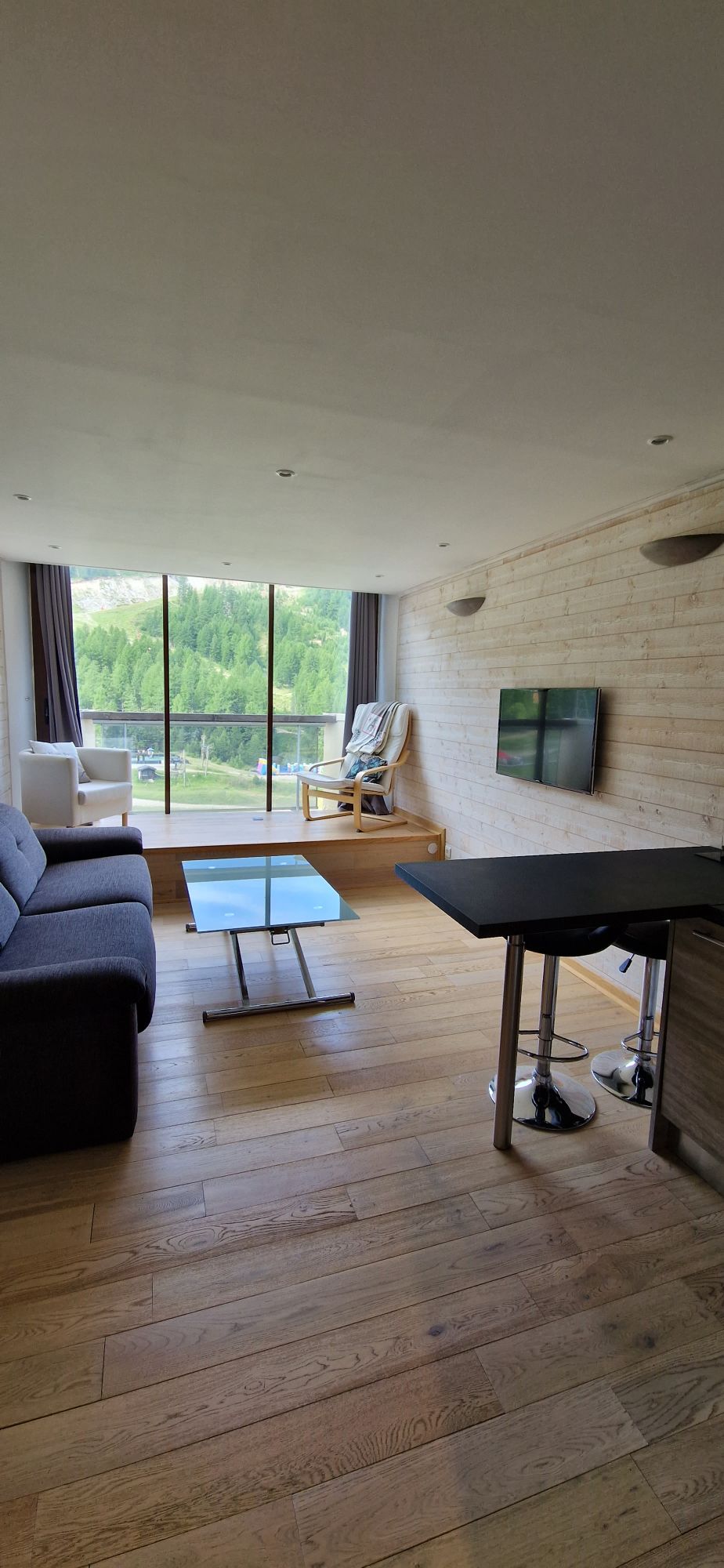 Très joli appartement entièrement rénové. En entrant, vous trouverez une chambre avec 3 lits simples. Puis, la salle de bain et les WC séparés. Ensuite le séjour, très lumineux ouvert directement sur la terrasse avec magnifique vue sur les montagnes. Un VRAI lit rabattable vous permet de profiter d'une nuit bien reposante. La cuisine est bien équipée : machines Nespresso, bouilloire électrique, toaster, raclette, four micro-onde, presse-fruit électrique... Place de parking, piscine, sauna.