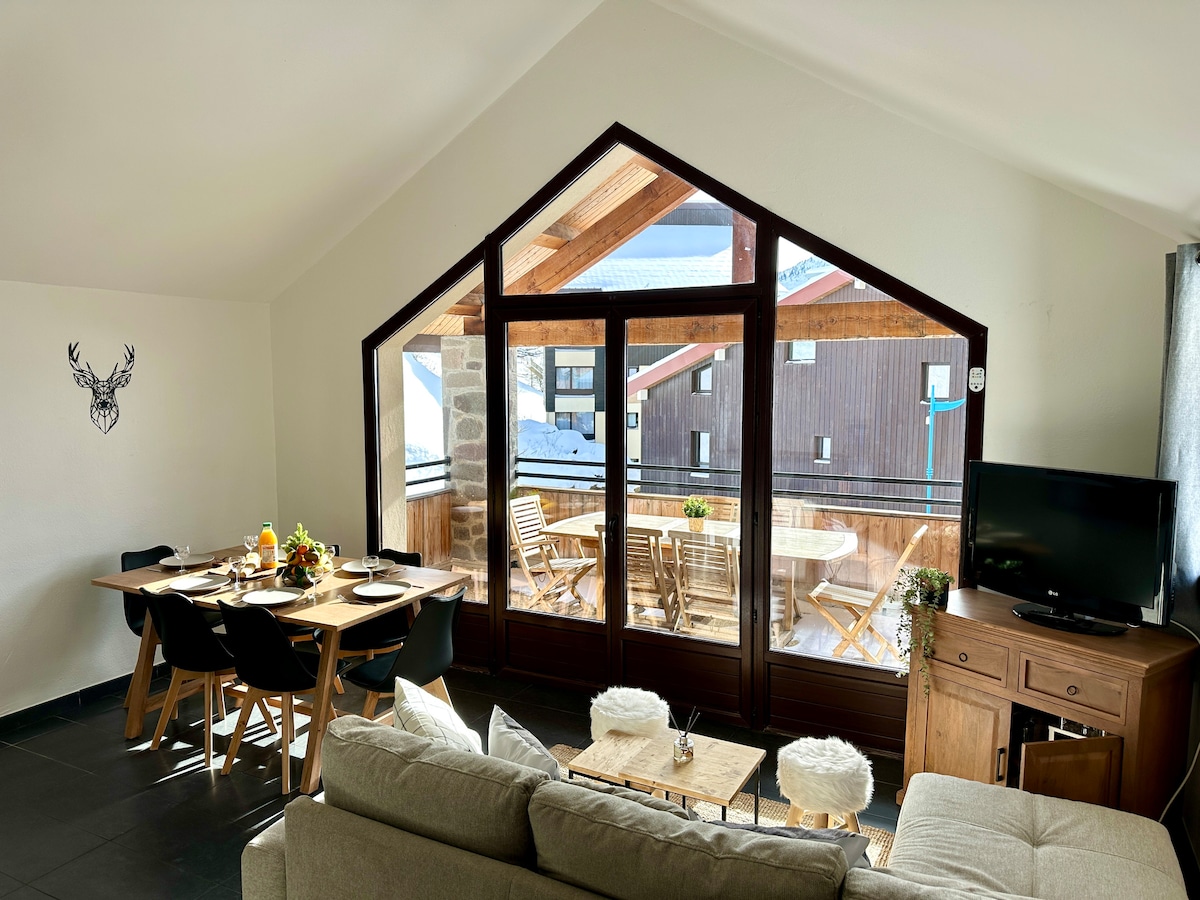 Our apartment has been renovated and furnished recently with care. Everything has been designed to be practical, harmonious and very comfortable. The bedding is first choice (160 bed / 160 sofa bed). The building is very well located (facing south) next to the funicular which takes you to the start of the slopes (2 mins away). The view of the mountains is spectacular. The 9 m2 terrace is a real plus in all seasons. Private parking in the basement.