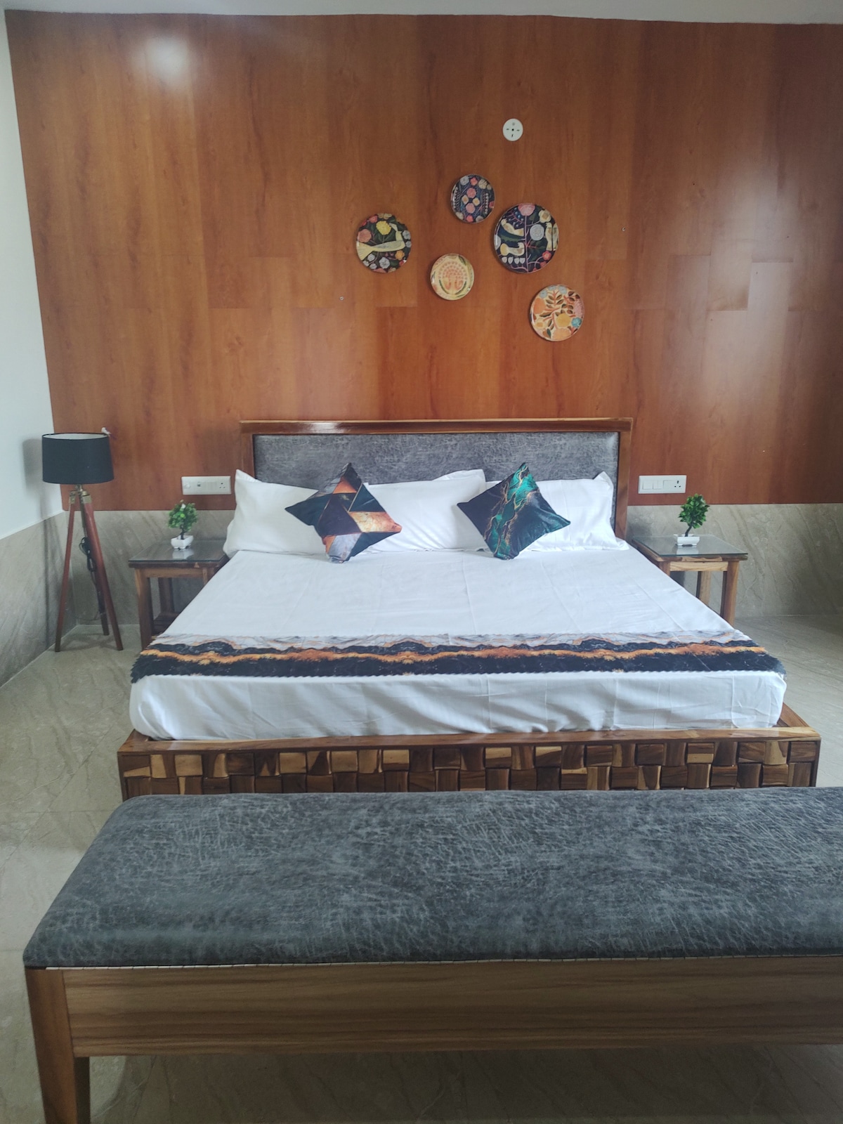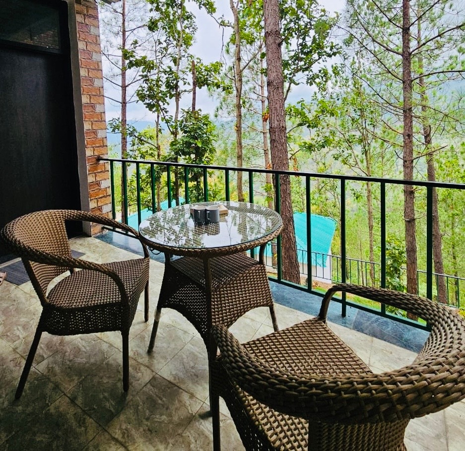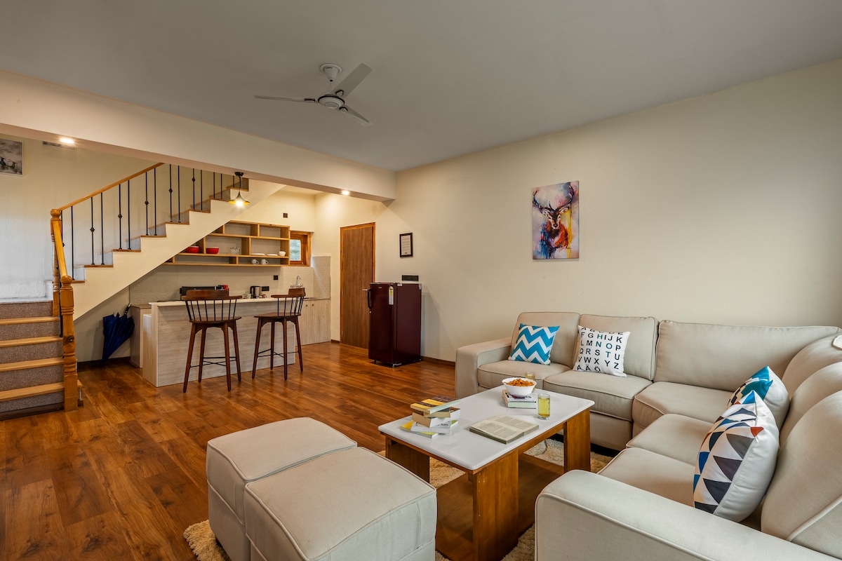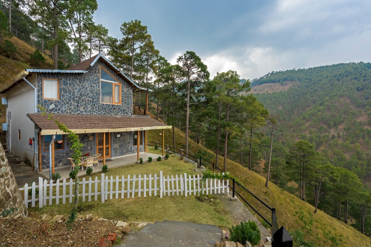 Amaya Chalet, a vacation property located in Lansdowne, Uttarakhand. It is described as a 2 BHK private villa with a garden and open terrace. The property offers various amenities, including a queen-size bed with mattress, almirah, dressing area, living room with a 5-seater sofa and 43-inch LED TV, parking, private kitchen, restaurant .