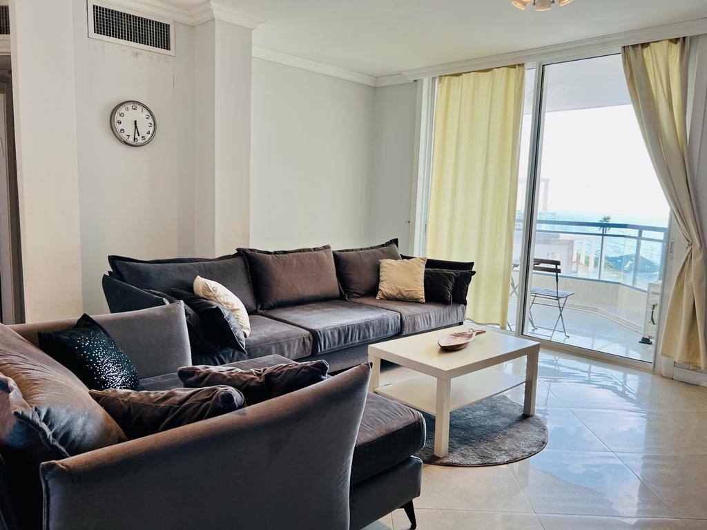 This beautiful 87m2 apt has an open concept kitchen to the living/dining room 2 bedrooms with 2 en-suite bathrooms and a balcony with a stunning view overlooking Yaffa St. The apt is decorated in high-end furniture to meet your all needs... The « all granite » kitchen is fully equipped with 2 sinks, 2 fridges and 2 ovens, a stove top and dishwasher. In the living room, you can enjoy a comfortable sofa as well as 2 lovely armchairs and a dining room table which can accommodate 6 comfortably.
