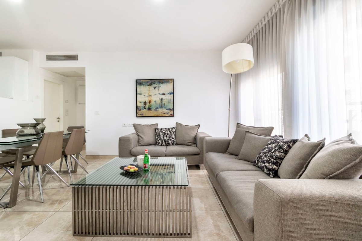 This beautiful 87m2 apt has an open concept kitchen to the living/dining room 2 bedrooms with 2 en-suite bathrooms and a balcony with a stunning view overlooking Yaffa St. The apt is decorated in high-end furniture to meet your all needs... The « all granite » kitchen is fully equipped with 2 sinks, 2 fridges and 2 ovens, a stove top and dishwasher. In the living room, you can enjoy a comfortable sofa as well as 2 lovely armchairs and a dining room table which can accommodate 6 comfortably.