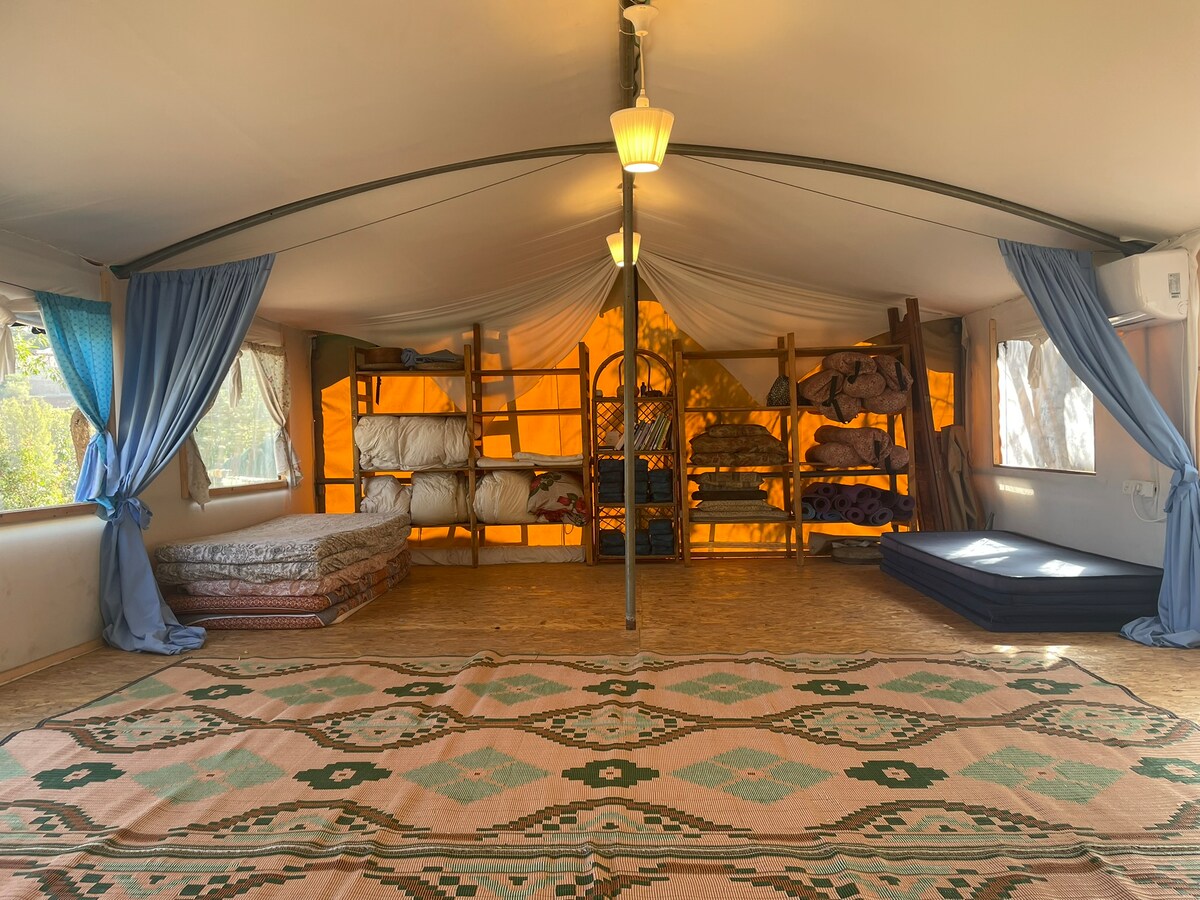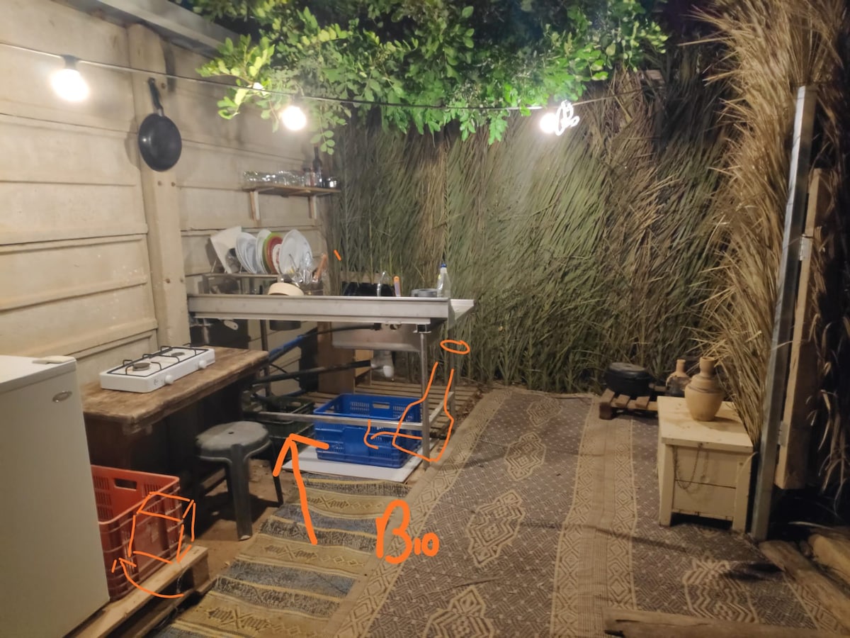 A cool and beautiful tent house In Pardes Chana, right next to the fields, surrounded with a spaceous garden . Thoug it's a tent it feels very cozy and spceouse,with a kitchenet,bathroom and toilet ,an outdoor pool ( on the summer) and shower, and lots of cute siting areas under the trees. it is as closes to nature it can be in the middle of town.