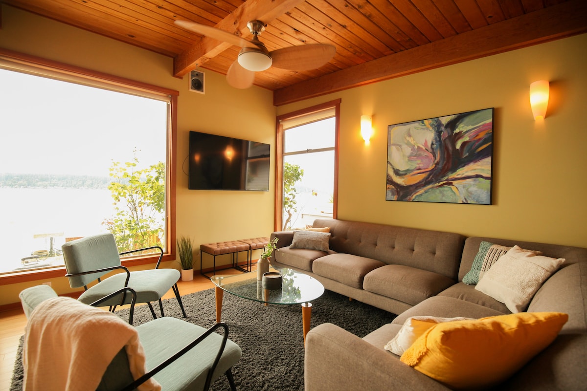 Recreate, relax & rejuvenate at water’s edge on Lake Sammamish! Enjoy sunsets from the private dock, the deck or the hot tub at water-side. Kayak or swim in the lake. Run or walk the Sammamish trail from the back of the house. Mid-century modern meets lakeside living. Enjoy the peaceful and intimate connection to nature and wildlife. Gaze through the expansive glass from the living room, dining room and kitchen just mere feet from the water.