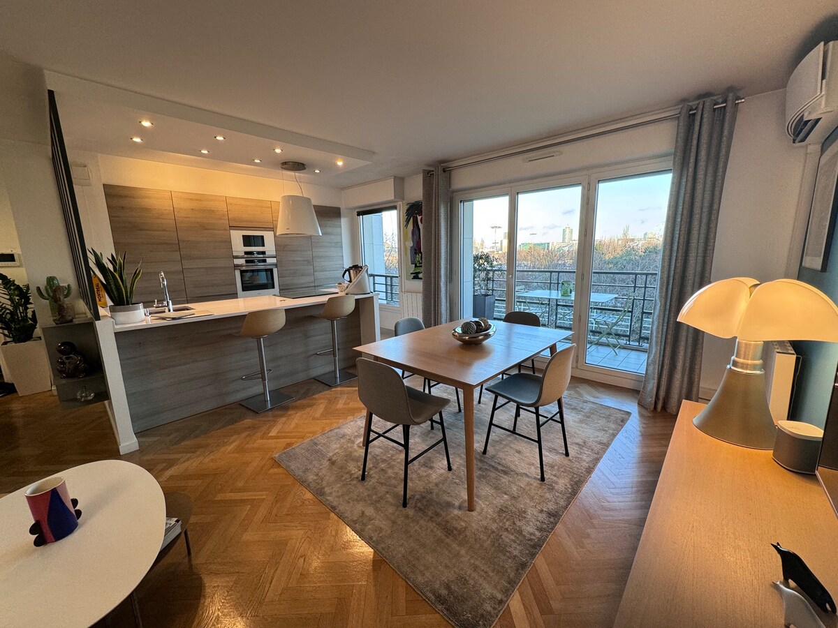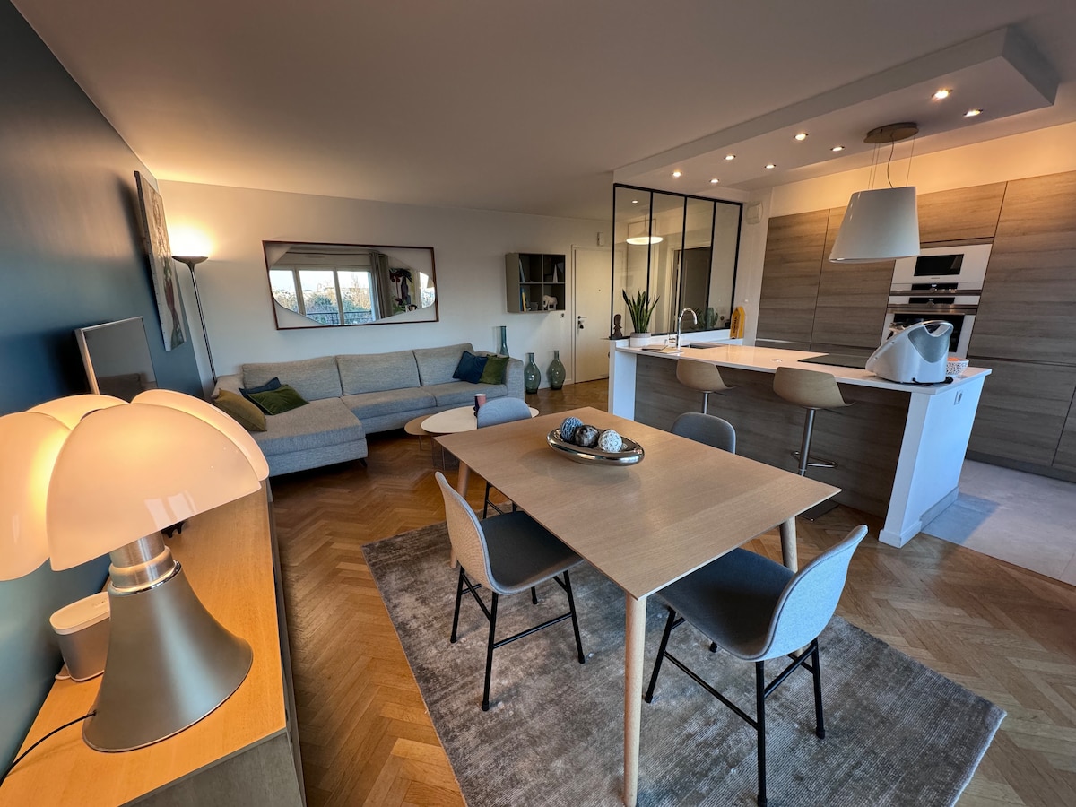 Appartement 3 pièces à Issy centre refait à neuf et très bien agencé avec matériaux et finitions de qualité 52m2 dans un immeuble sécurisé avec ascenseur - un séjour avec salle à manger, salon, TV - une cuisine neuve entièrement équipée haut de gamme - 2 chambres (1 lit 160 et 1 lit 140x200) avec placard/rangement - une salle de bain avec douche à l'italienne et une salle d'eau Meubles italiens et sanitaire/électroménager allemand Simple, élégant et espace bien utilisé Non- accessible aux PMR
