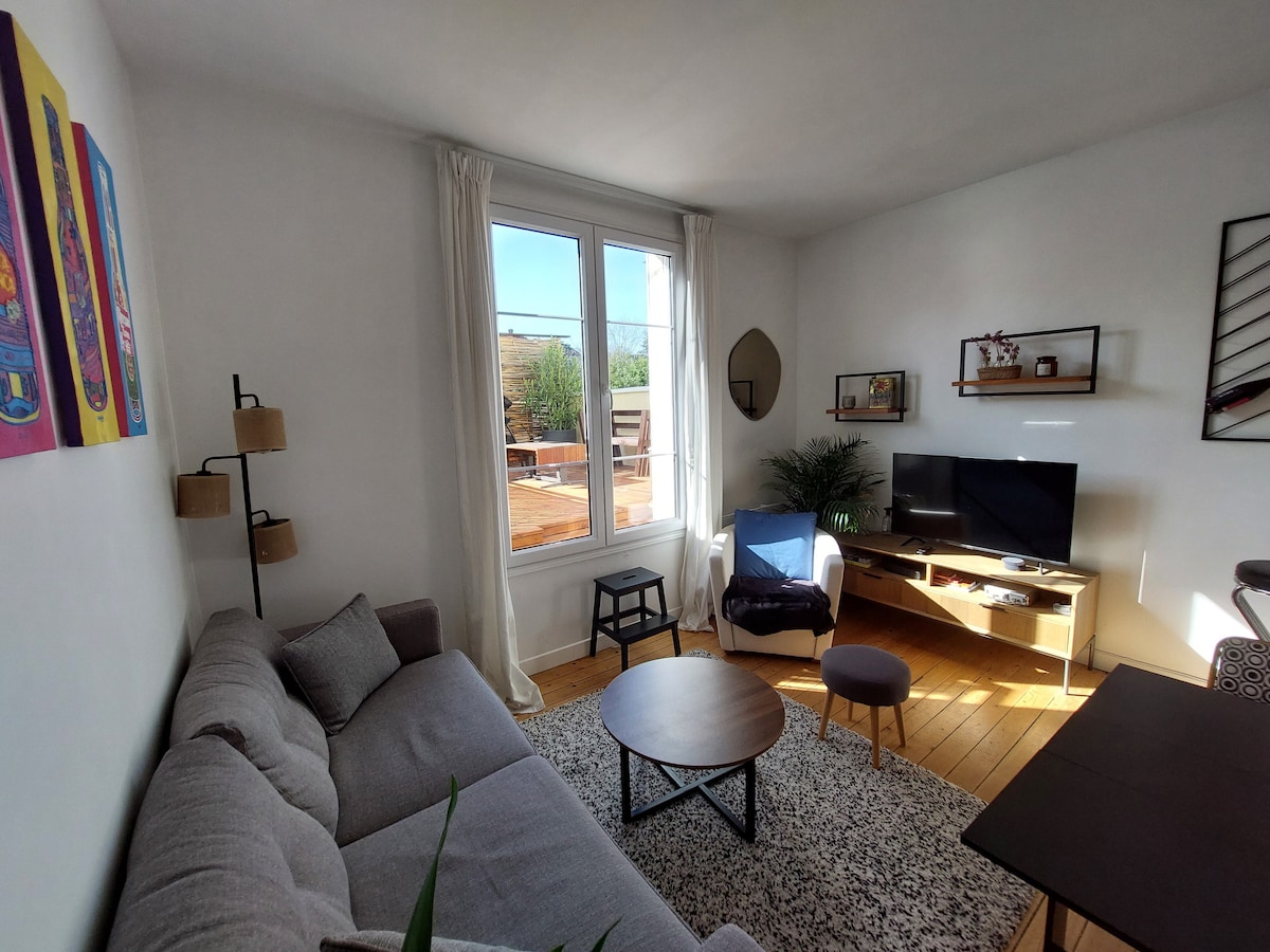 Superbe appartement de 60m2 avec jacuzzi sur terrasse de 20m2 ainsi qu'une cabine hammam et sauna. Appartement situé au 2ème étage d'une maison, meublé avec gout, grande baie vitrée qui donne sur une terrasse de 20 m2 avec jacuzzi, bains de soleil et fauteuil suspendu, cuisine équipée, une chambre avec lit double et un grand canapé panoramique convertible pour 2 personnes, sdb avec cabine de douche hammam/sauna. Idéal pour un moment romantique et escapade à Paris. *FÊTE ou SOIRÉE INTERDITES