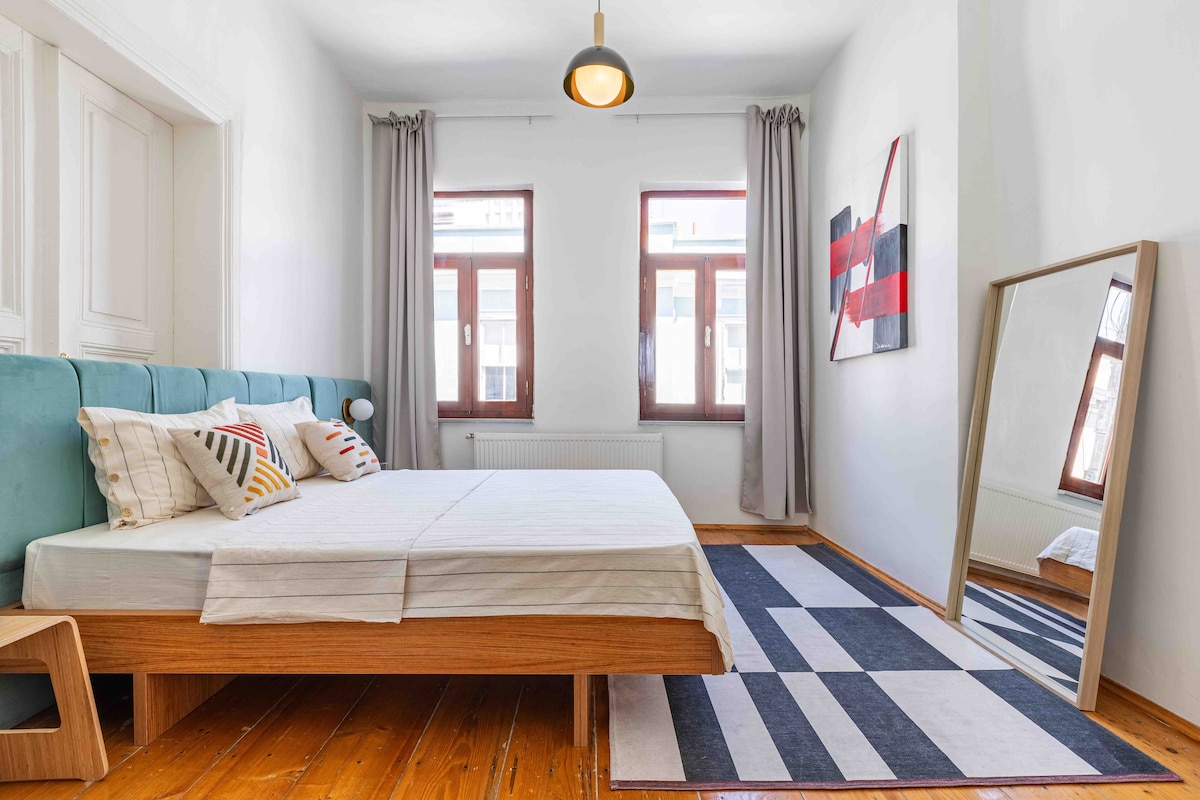 Enjoy a comfortable stay in our modern 65 m² residence within walking distance of Taksim Square. Cozy bedroom with balcony, bright living room, and fully equipped kitchen. Experience the comfort of a home with hotel-quality convenience and cleanliness. Located in a secure building with 24/7 security and elevator access, ideal for families, couples, and business travelers. Transport, restaurants, and shops are nearby, yet the area is peaceful and safe.