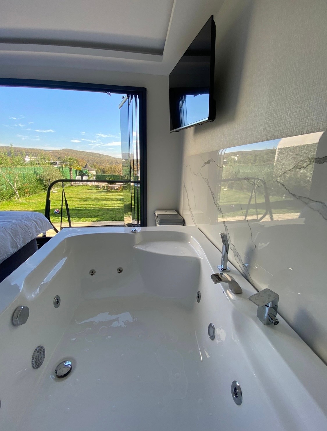 按摩浴缸、完全独立的花园、游泳池、小屋