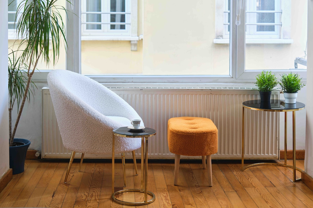 This private luxury flat has been recently renovated. It has high ceiling(3.6 meters),quite large bathroom, king size bedroom, sauna, jacuzzi, wall projector & fireplace. It is very suitable for short or long term staying visitors, couples & families, and its located at 1st floor of our apartment in a safe street at Beyoglu/Taksim. Its reachable by elevator, or stairs. Our building is next to Istiklal Street & 10 mins away from famous Galata Port by walk. Internet is 100 MBPS solid fiber!