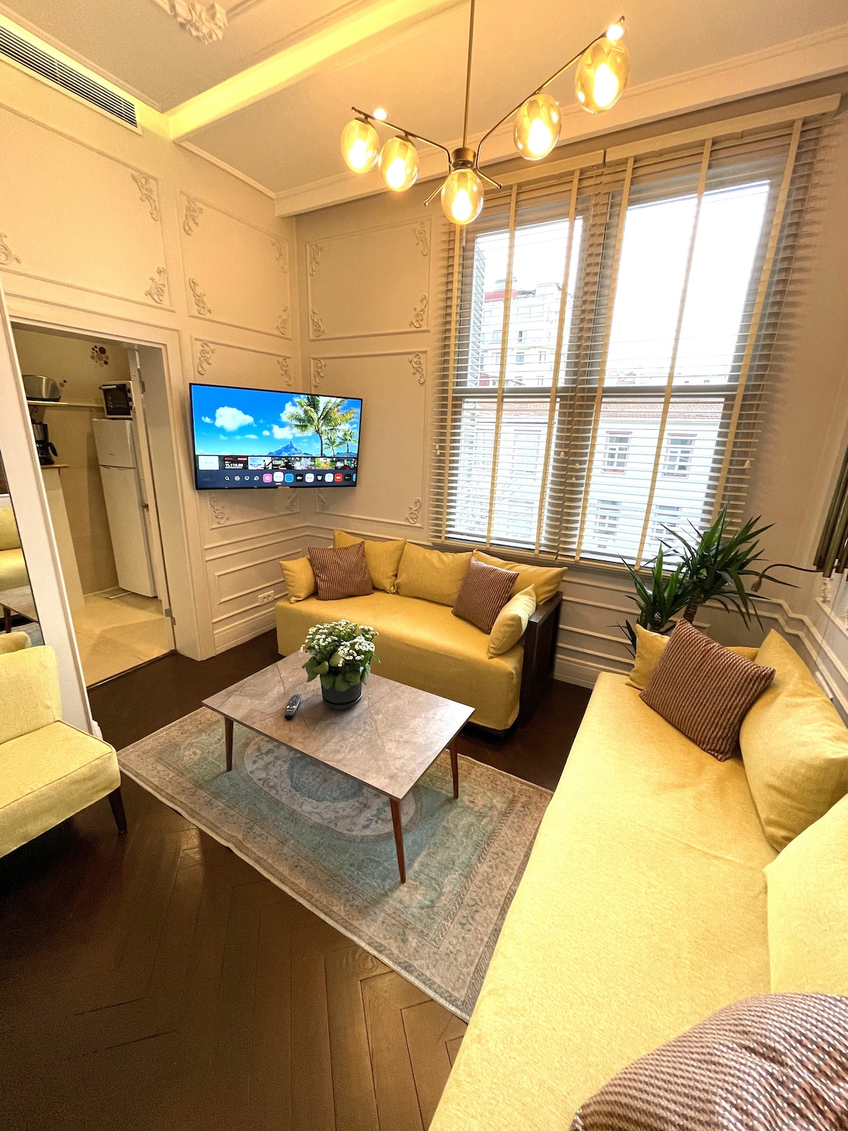 Step into this apartment, grab your welcome drink and feel a sense of calm with a MAGNIFICENT PANORAMIC BOSPHORUS view... Wander straight through the modern, trendy and bright interior while watching the joyful traffic of ferries, cruises and sails. REMINDING THAT! Flat is located on the 4th floor of the building with NO ELEVATOR! Cihangir is a hilly area with up/down&stairs. Which might not be suitable for the elderly or guests with infants. We can provide bellboy service at extra cost.
