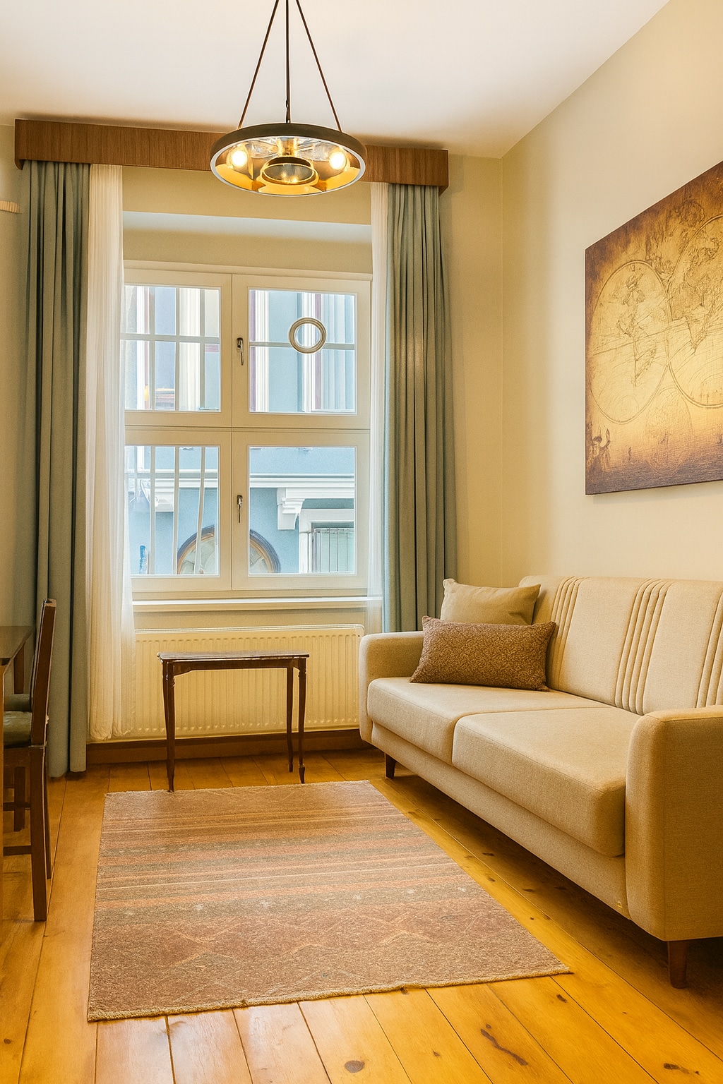Cozy 2-bedroom Galata apartment with a living room, dining area, and a fully equipped kitchen. Features natural gas heating and air conditioning for year-round comfort. Styled in a local Galata home design, it offers charm and convenience. Located on the enterance floor, perfect for those seeking a central yet quiet retreat. Enjoy prompt assistance with our Superhost service. Ideal for a memorable stay in the heart of Istanbul! Fast internet 6 min walk to Galata Tower, Galata Port, İstiklal
